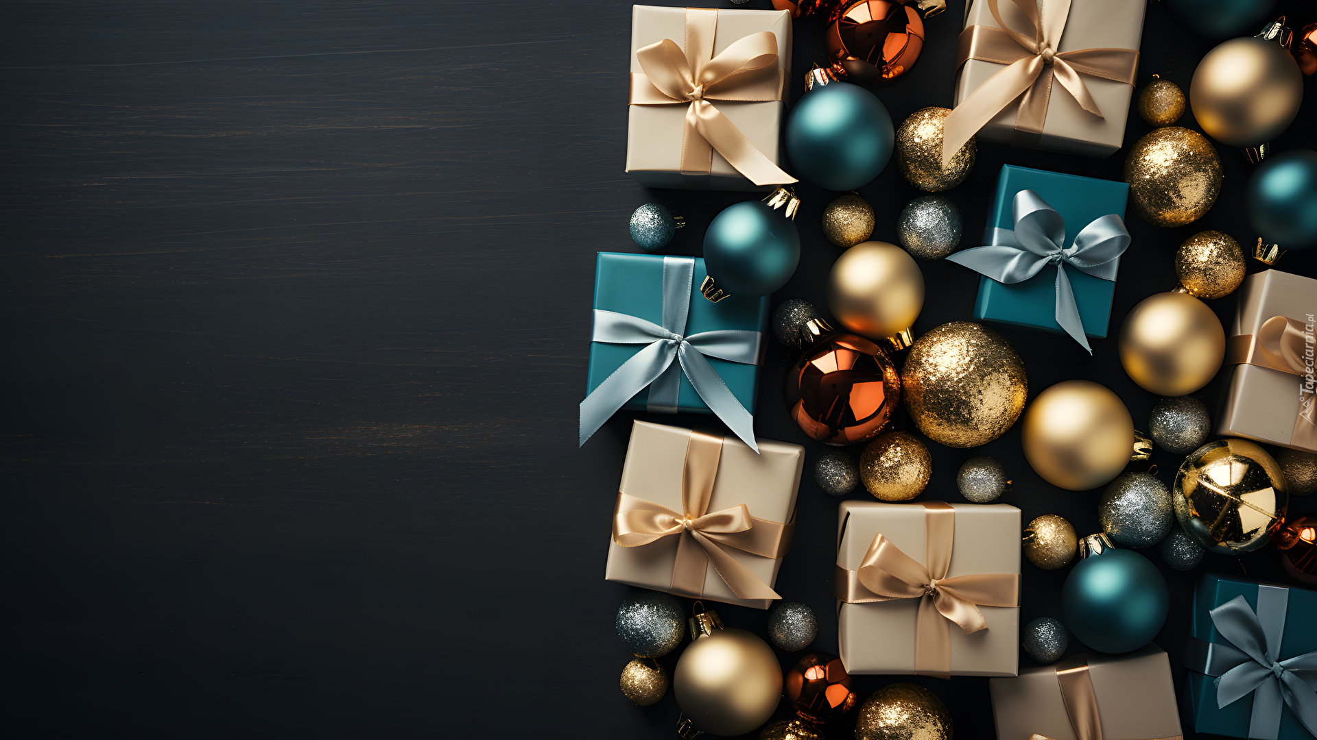 Edytor tapety: Kolorowe pudełka z prezentami wśród bombek