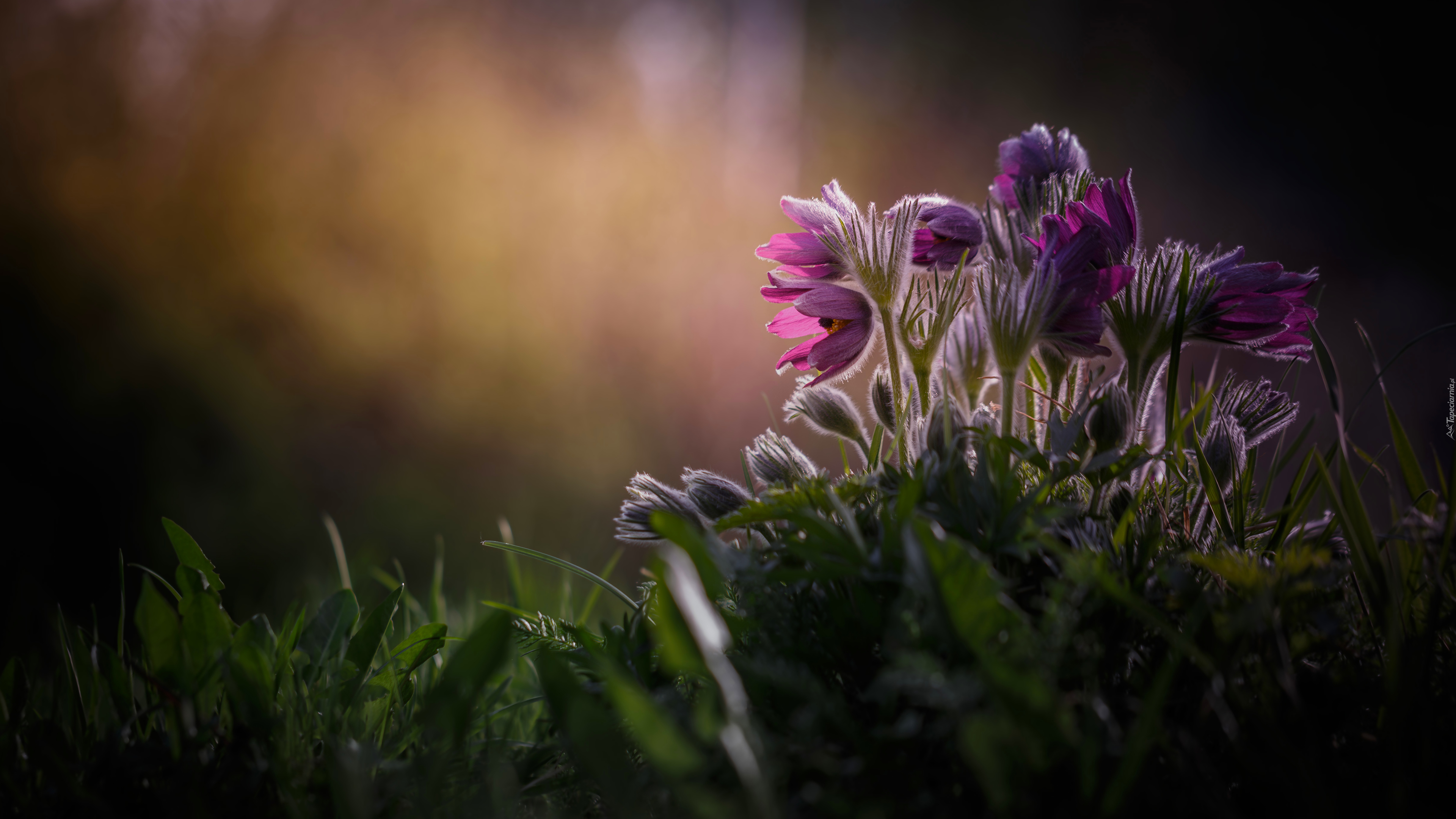Edytor tapety: Kępka rozświetlonych sasanek w trawie
