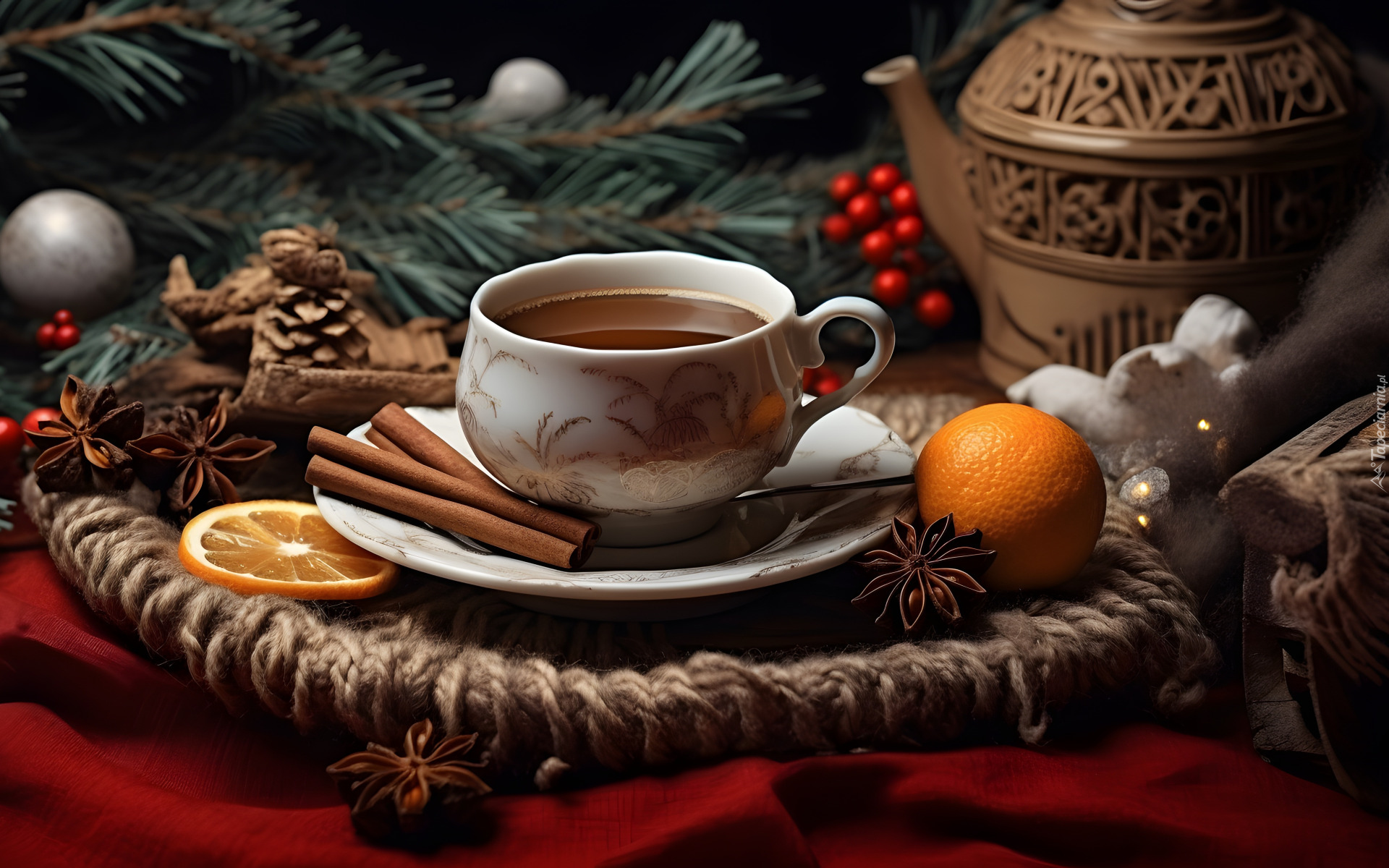 Edytor tapety: Filiżanka z herbatą obok pomarańczy i cynamonu