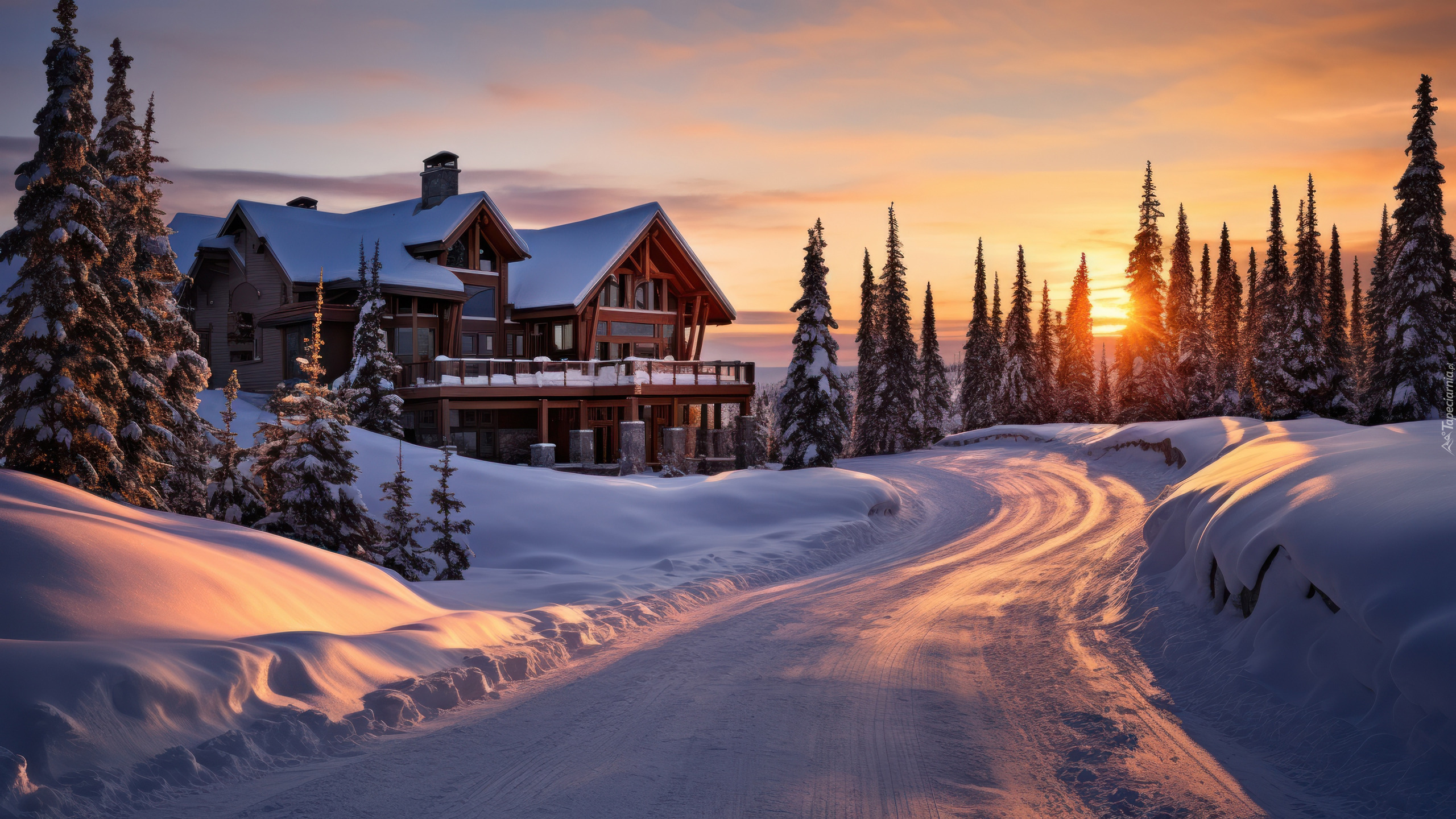 Edytor tapety: Zasypana droga śniegiem i ośnieżony dom