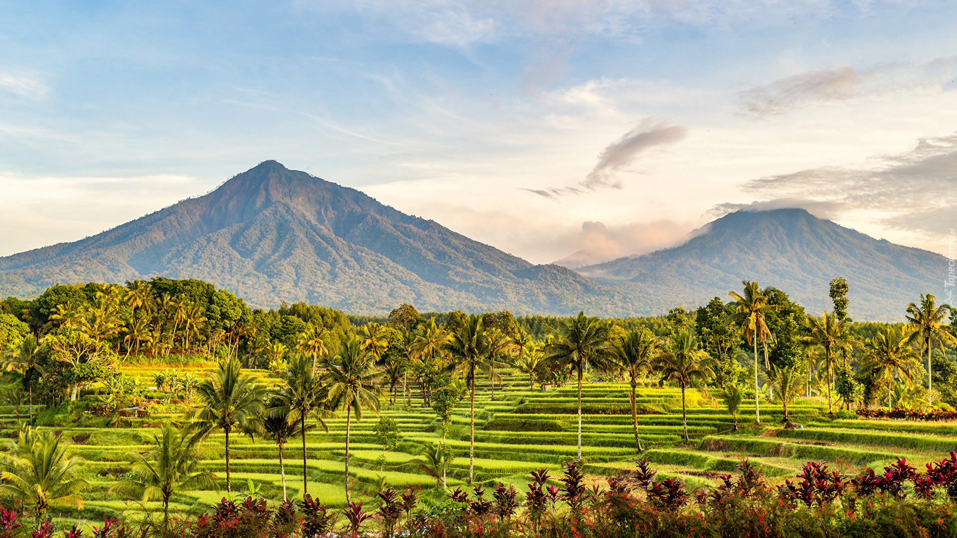 Edytor tapety: Palmy na polach i góry w tle
