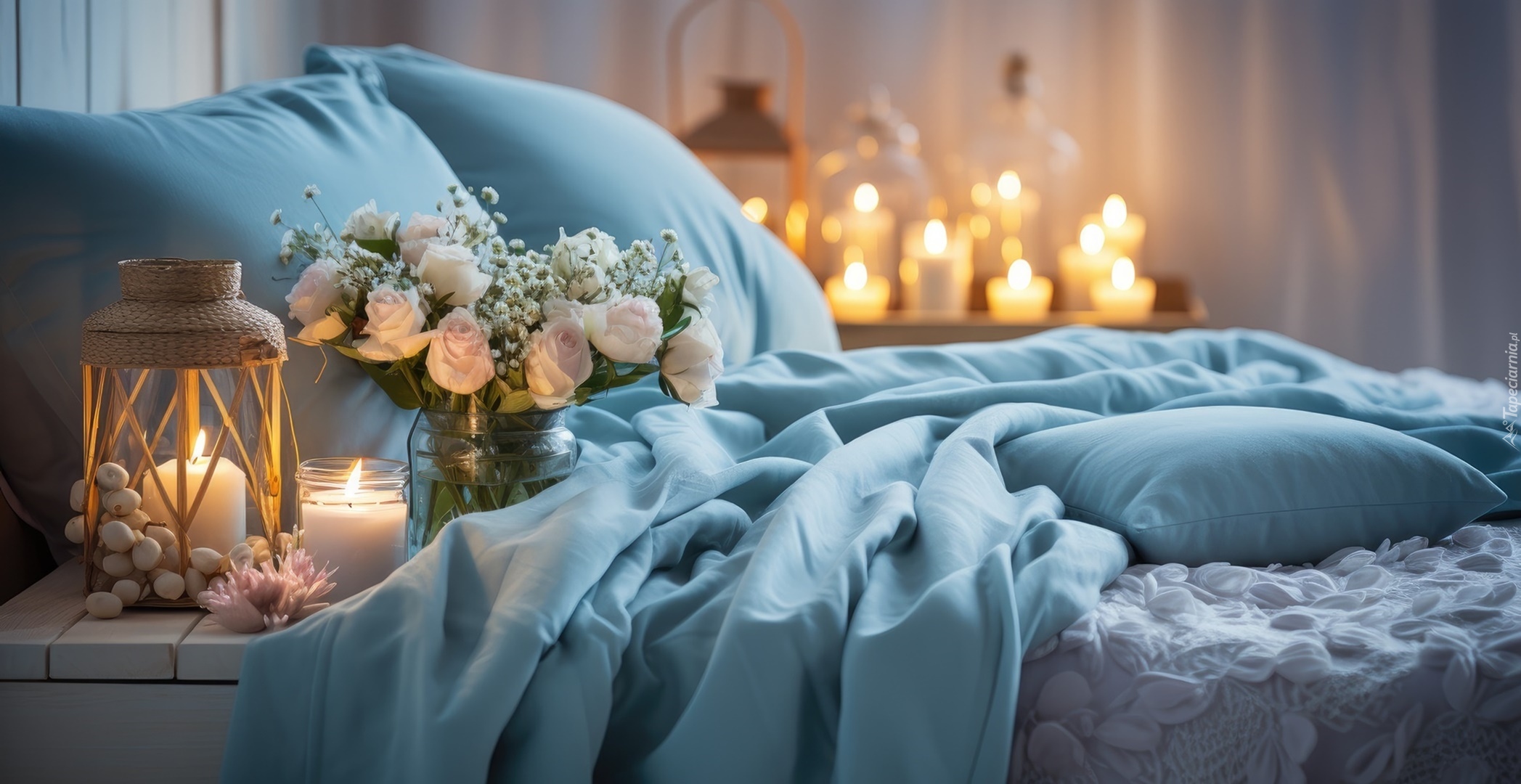 Edytor tapety: Świece i lampion z bukietem róż obok łóżka