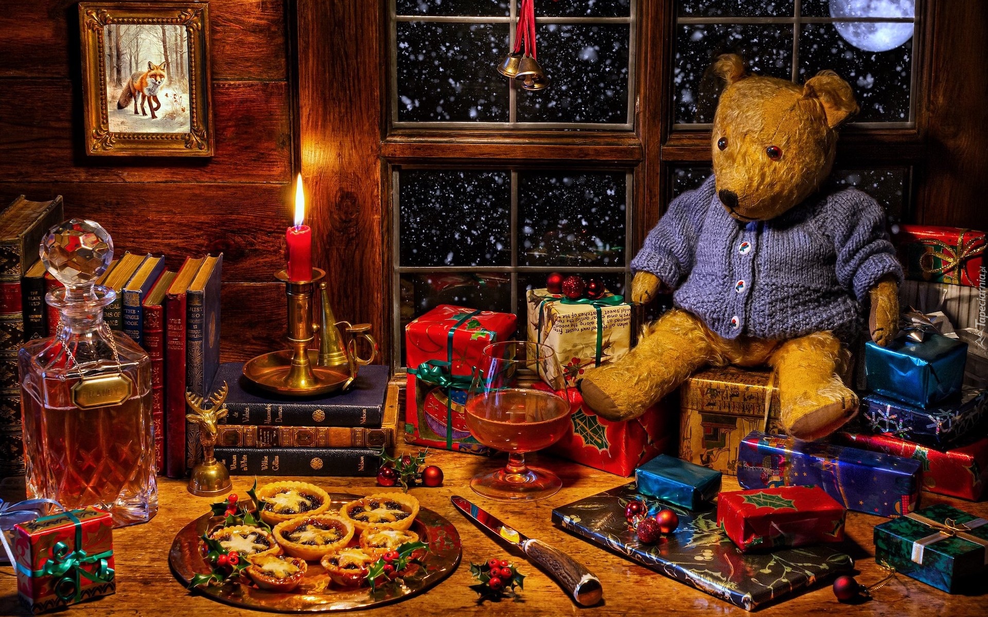 Edytor tapety: Pluszowy miś i prezenty obok świecy przy oknie