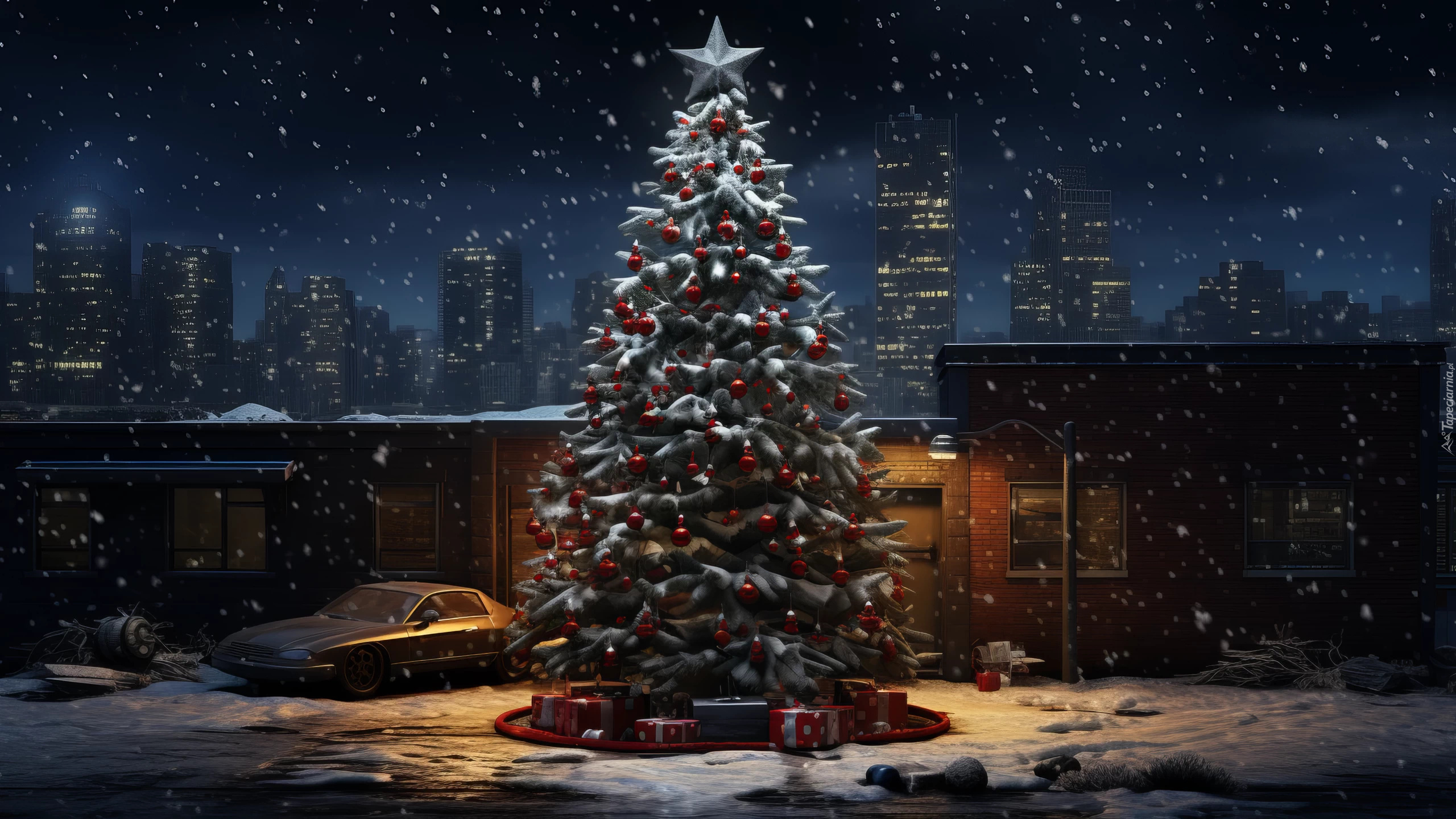 Edytor tapety: Samochód i prezenty pod udekorowaną choinką przed domem
