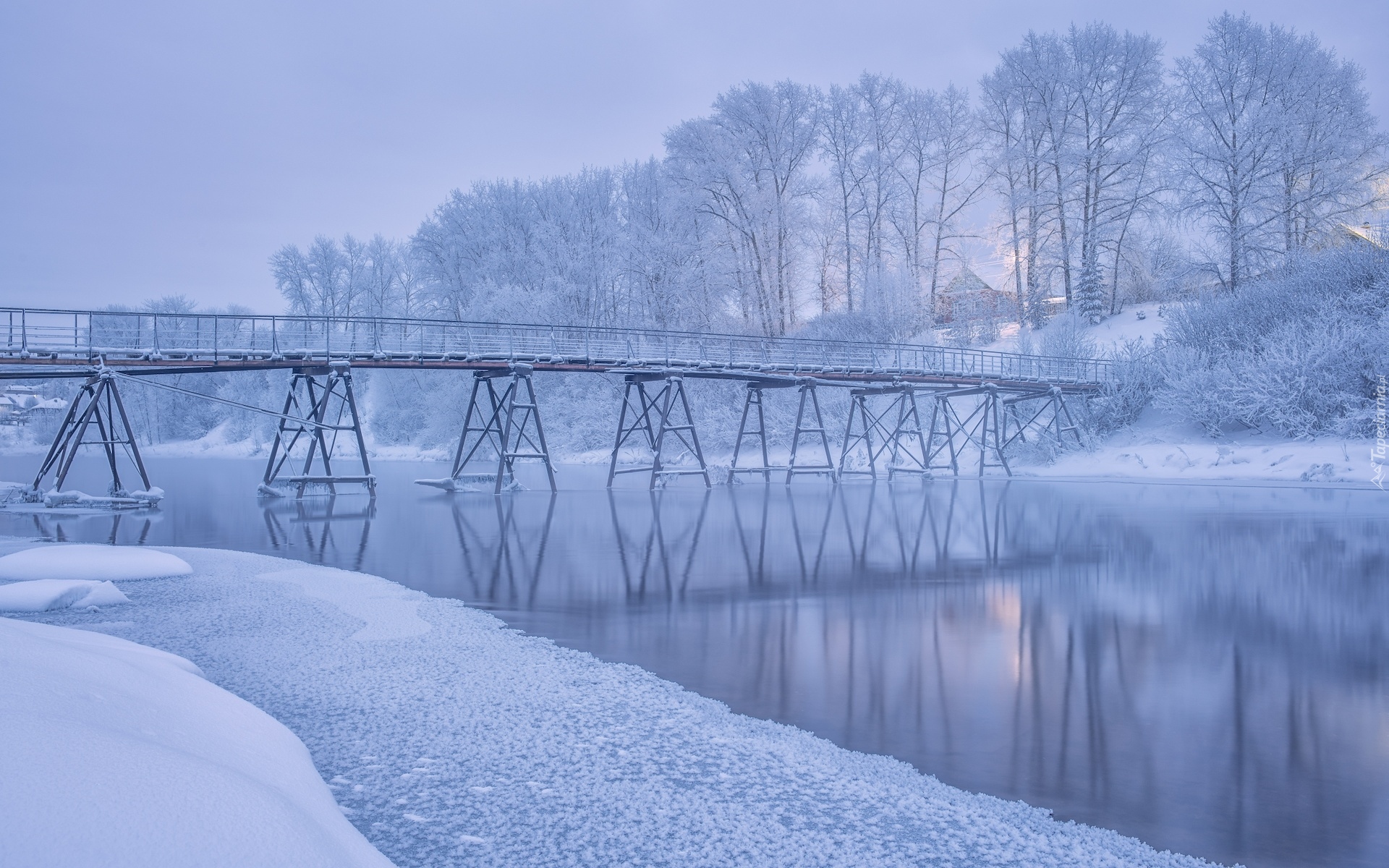 Edytor tapety: Drzewa i most nad rzeką zimową porą