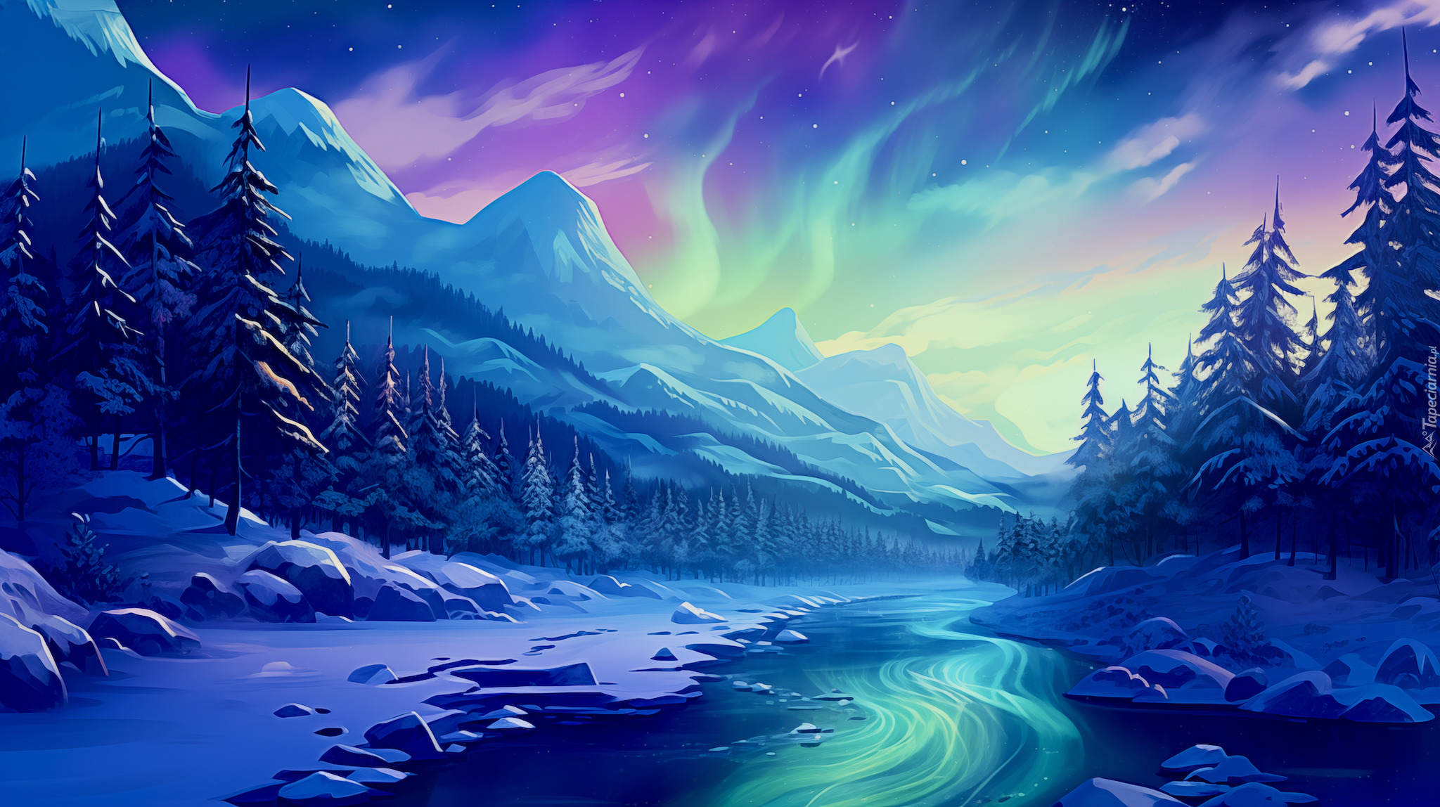 Edytor tapety: Zorza polarna nad górami i rzeką