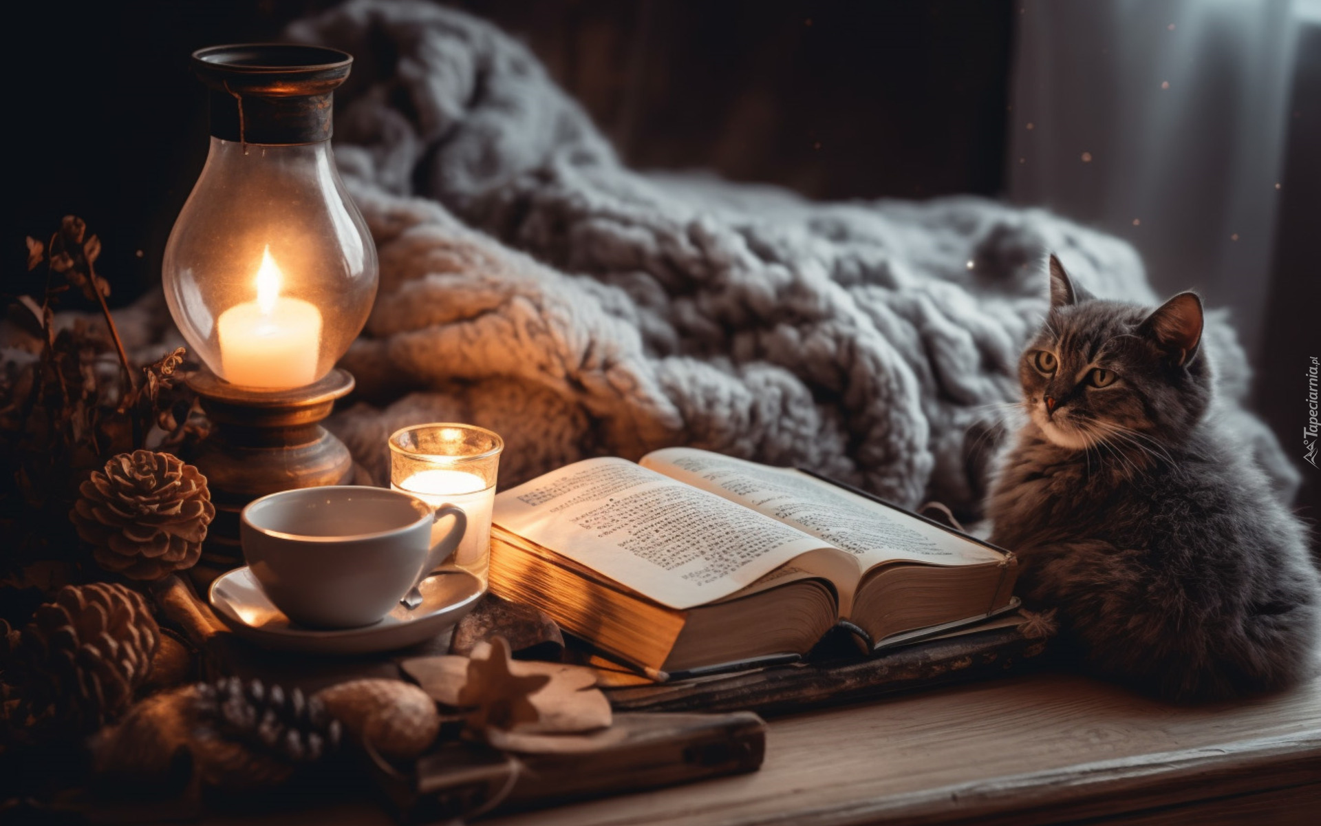 Edytor tapety: Kotek siedzący przy książce i lampie