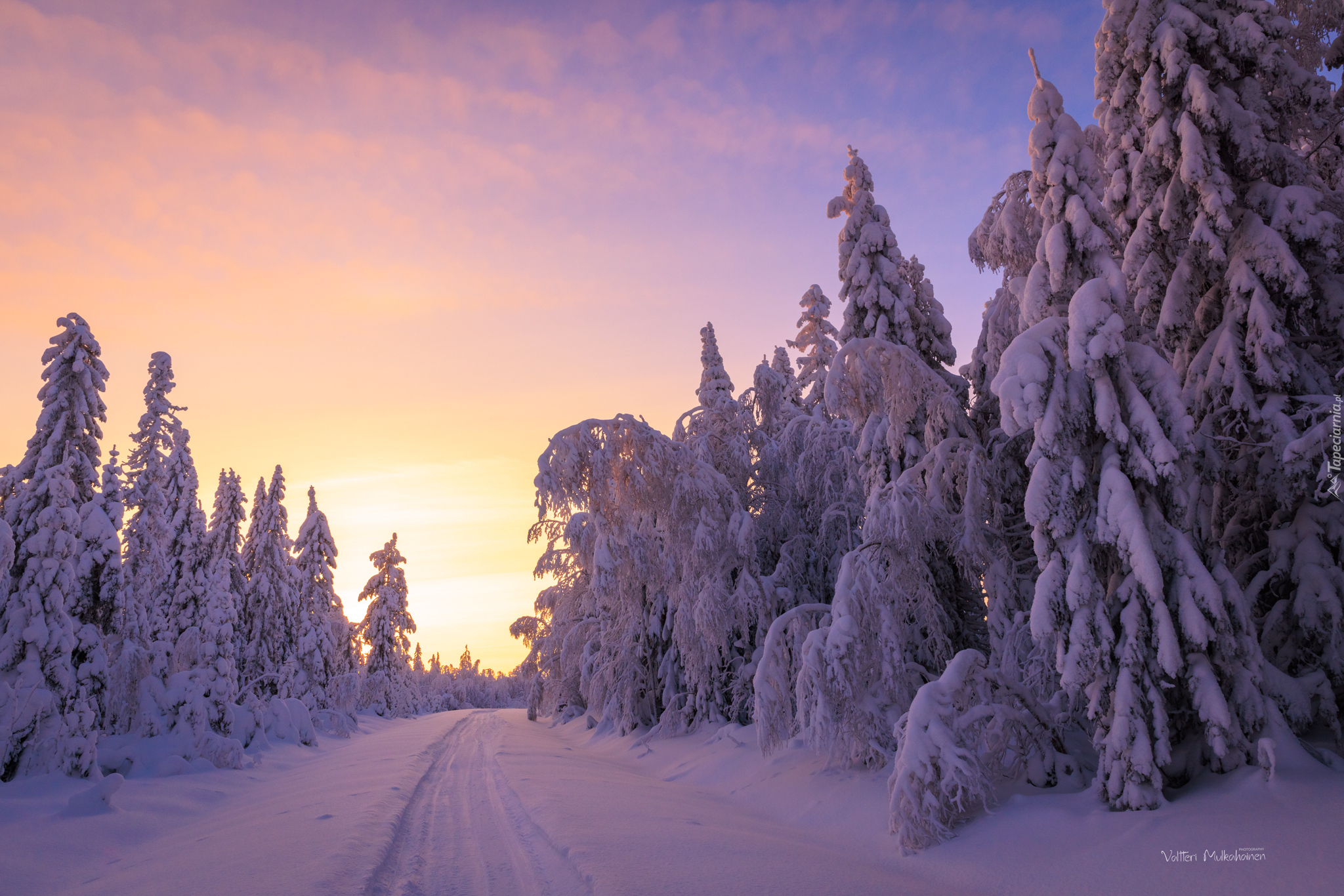 Edytor tapety: Słoneczny poranek nad ośnieżonymi drzewami przy drodze