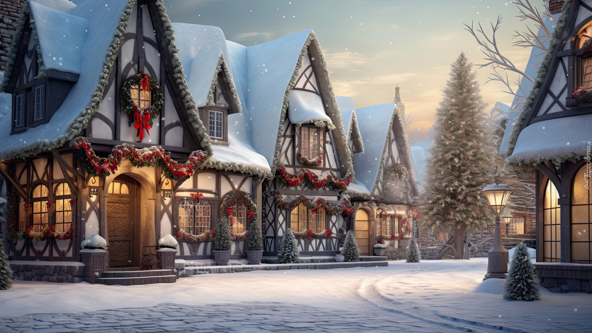 Edytor tapety: Udekorowane świątecznie ośnieżone domy przy ulicy w miasteczku
