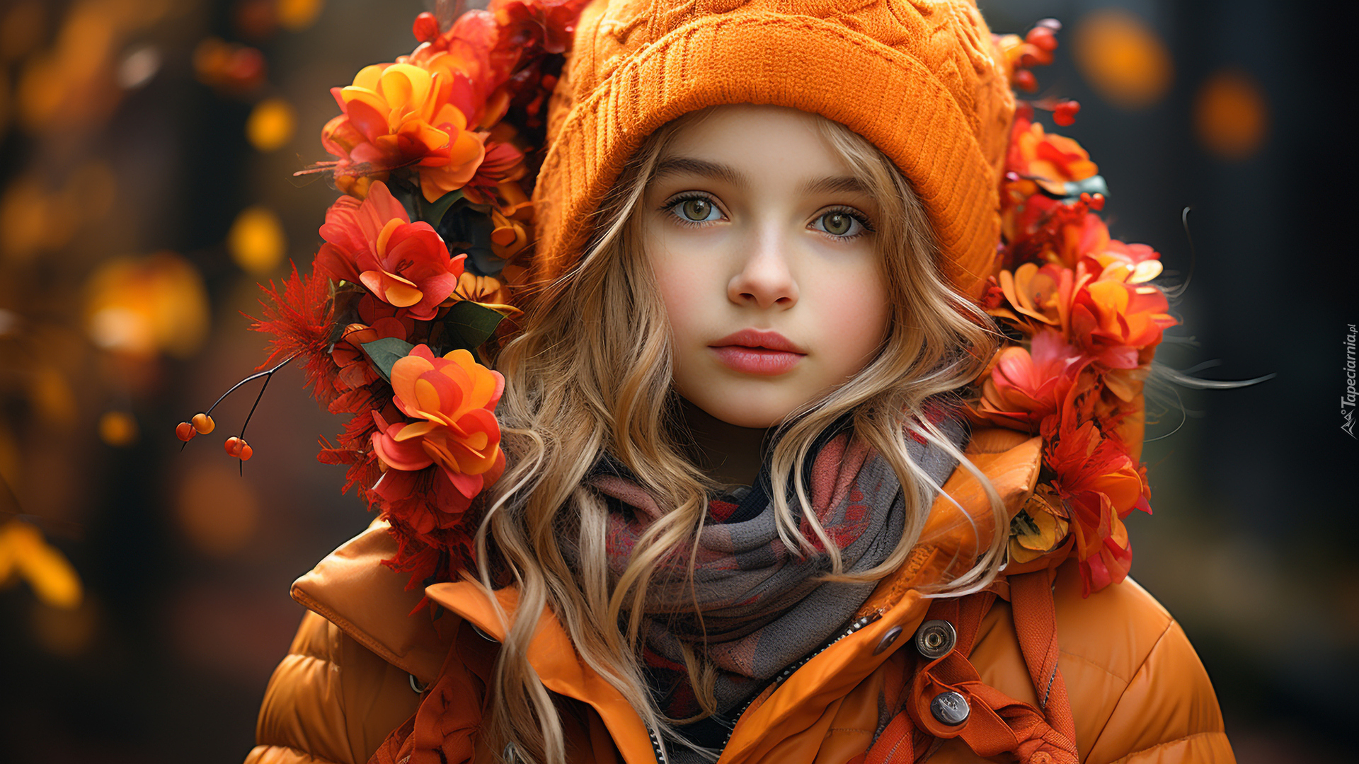 Edytor tapety: Dziewczynka w pomarańczowej kurtce i kwiatami na kapturze