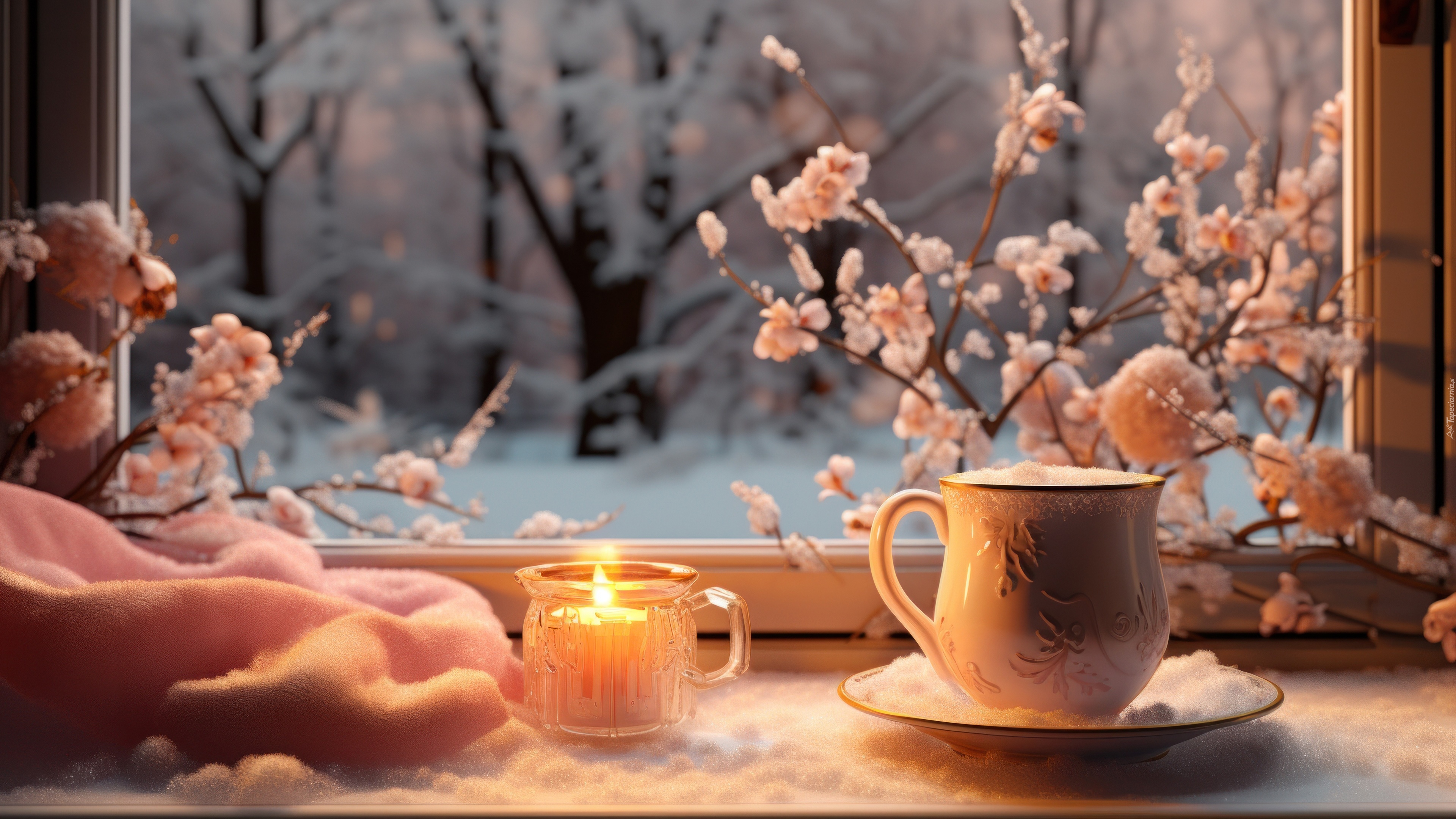 Edytor tapety: Płonąca świeca i filiżanka na parapecie okna
