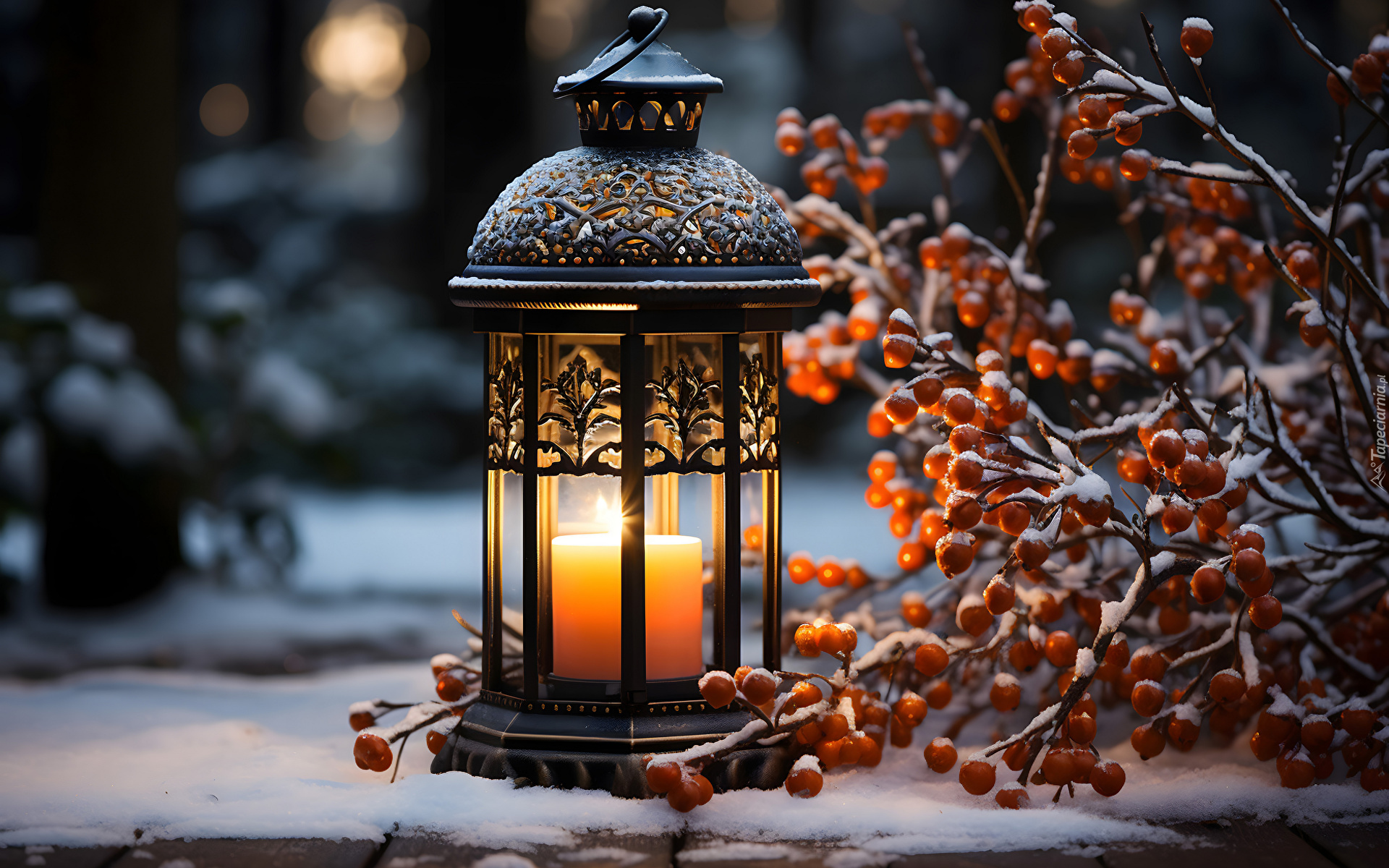 Edytor tapety: Oszroniona gałązka z jagodami obok lampionu ze świecą