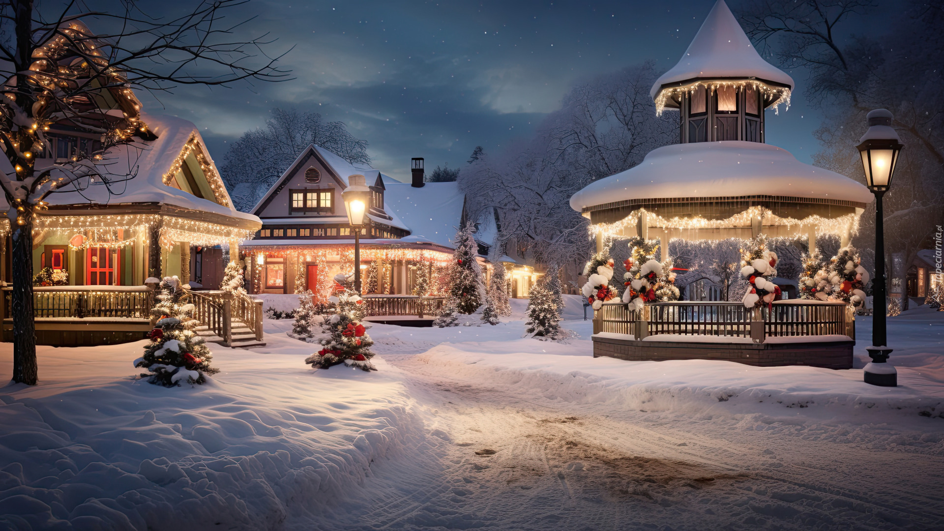 Edytor tapety: Oświetlona altana i domy w zimowy wieczór