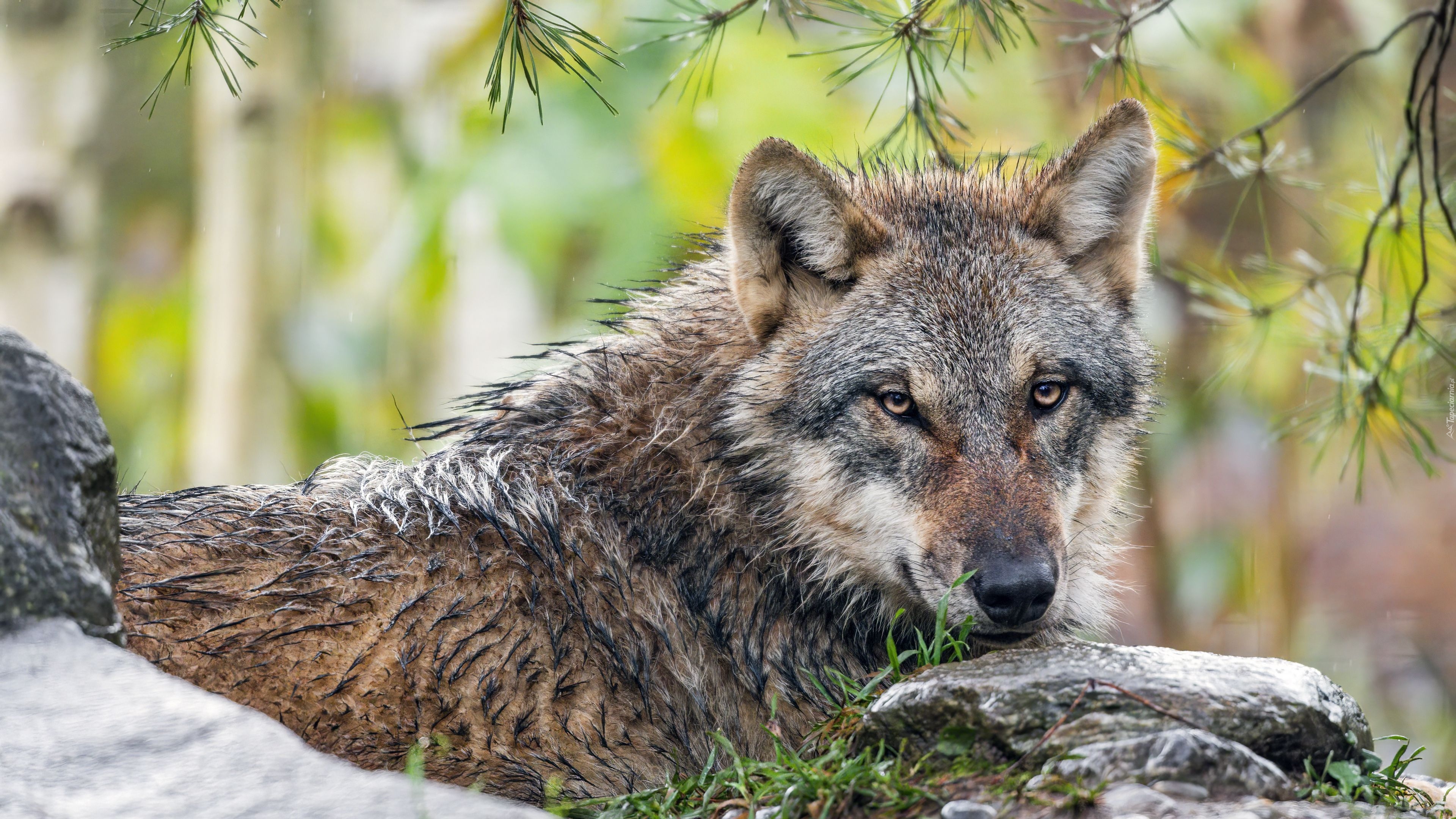 Edytor tapety: Wilk leżący na trawie obok kamieni