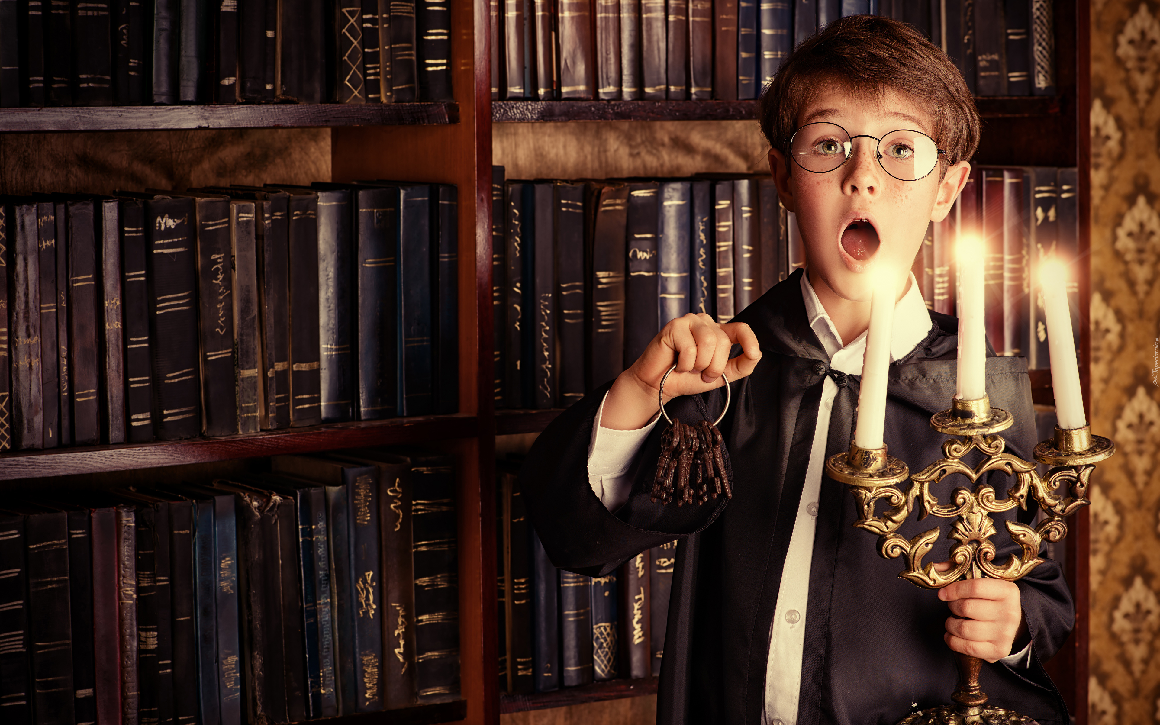 Edytor tapety: Chłopiec z otwartą buzią trzymający klucze i świecznik