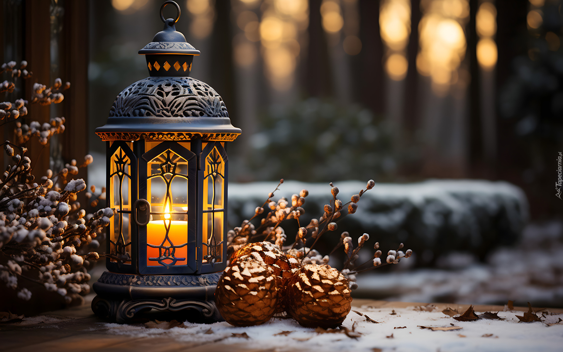 Edytor tapety: Lampion obok gałązek i szyszek na śniegu