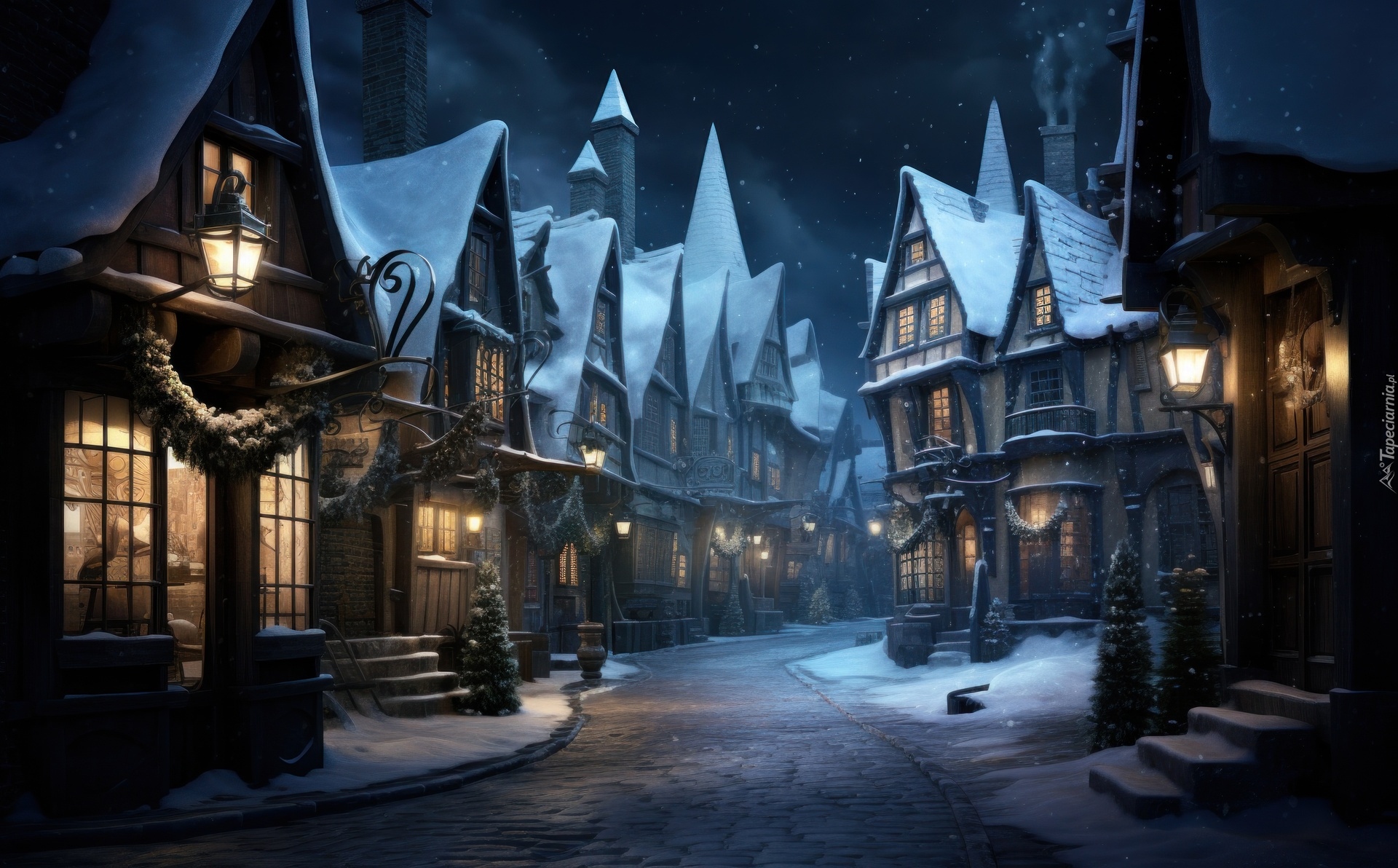 Edytor tapety: Ośnieżone i oświetlone domy przy ulicy nocną porą
