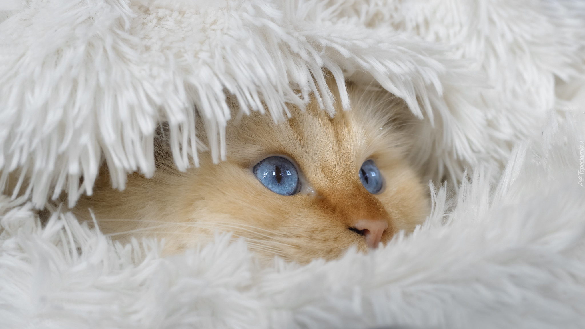 Edytor tapety: Głowa niebieskookiego kota pod kocem