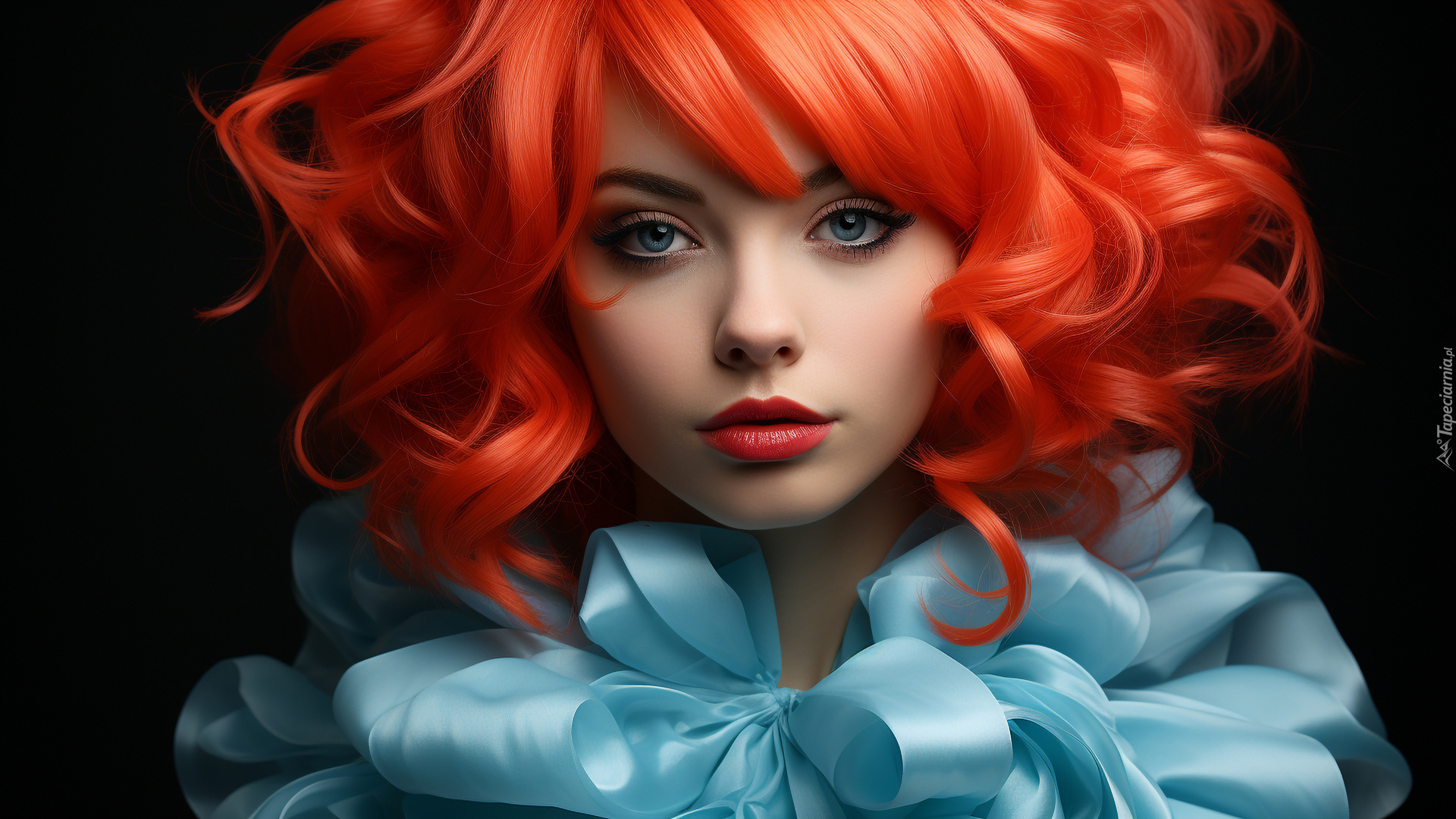Edytor tapety: Rudowłosa kobieta i z niebieskimi kokardami na szyi