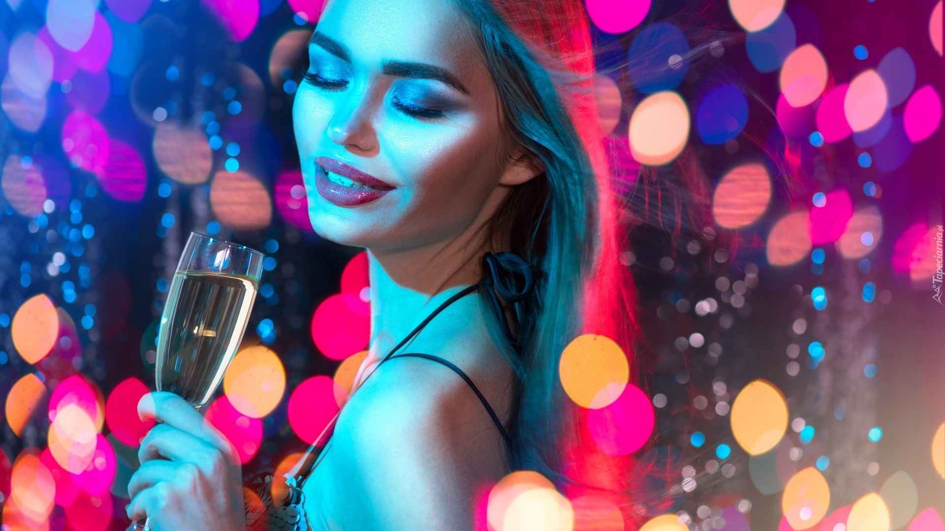 Edytor tapety: Długowłosa kobieta z kieliszkiem szampana