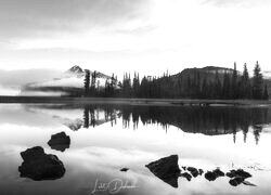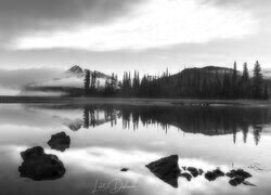 Edytor tapety: Drzewa nad jeziorem Sparks Lake z widokiem na zamglone góry