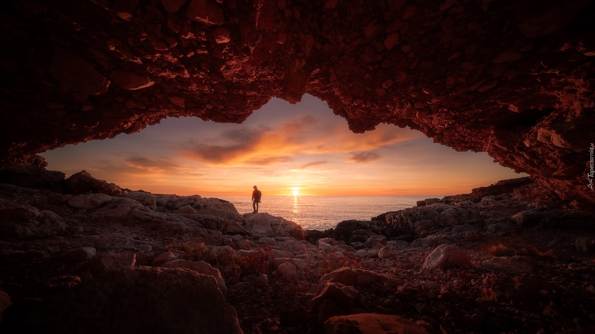 Edytor tapety: Widok z jaskini na człowieka spoglądającego na morze