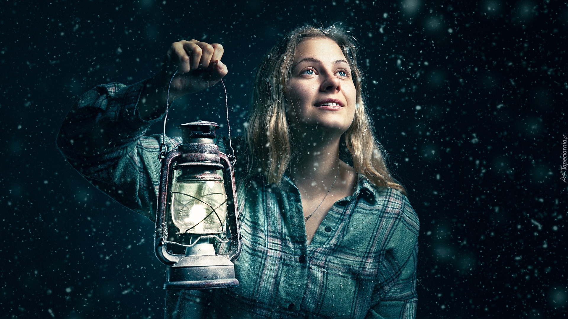 Edytor tapety: Kobieta trzymająca lampę i padający śnieg