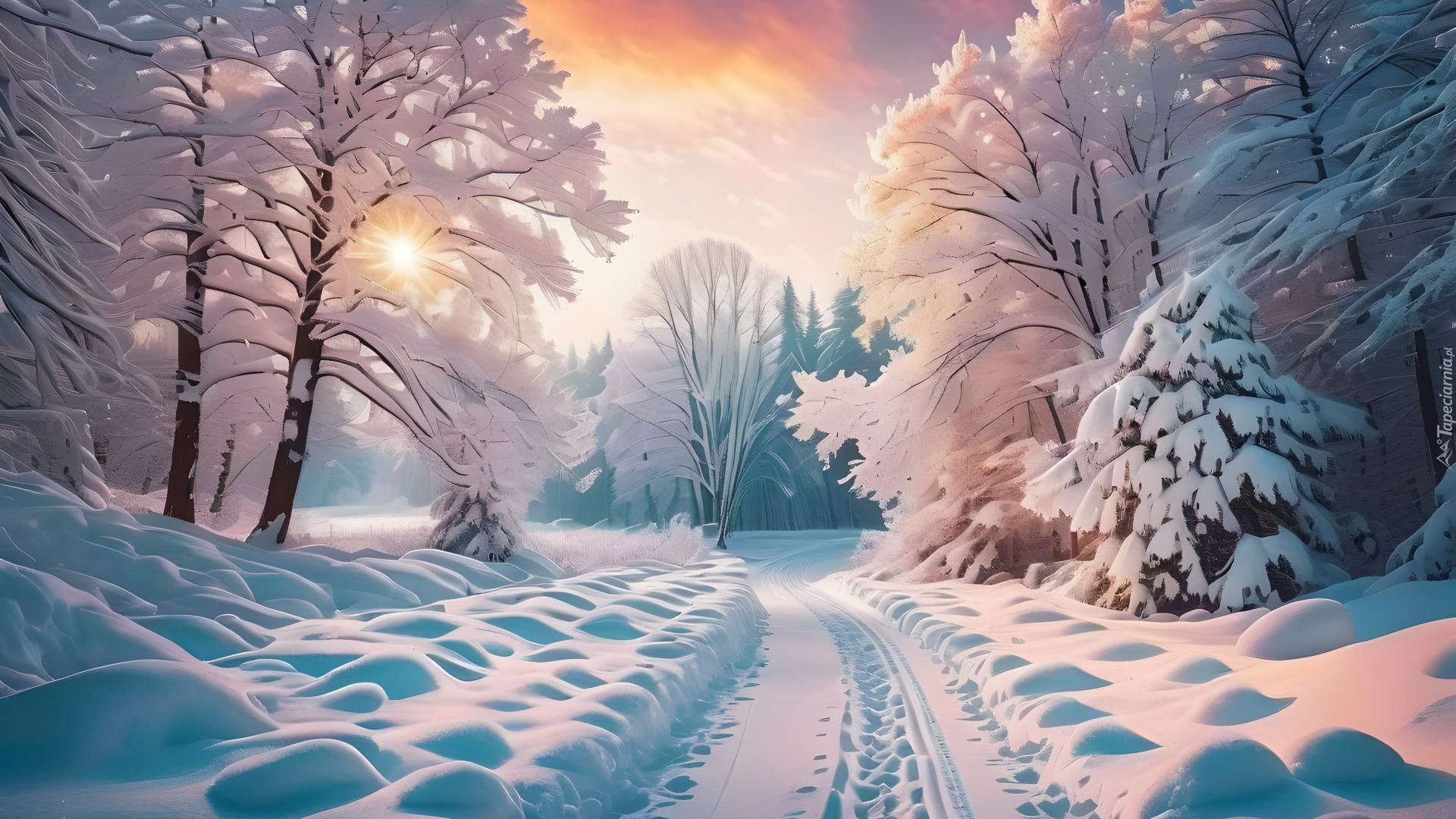 Edytor tapety: Rozświetlone słońcem ośnieżone drzewa przy zasypanej śniegiem drodze