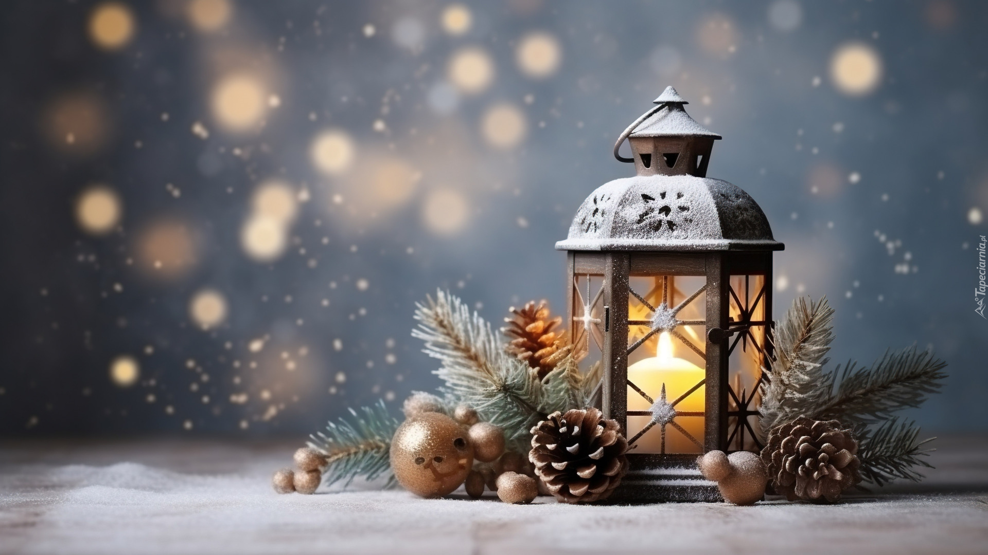 Edytor tapety: Szyszki i gałązki na śniegu obok zapalonego lampionu