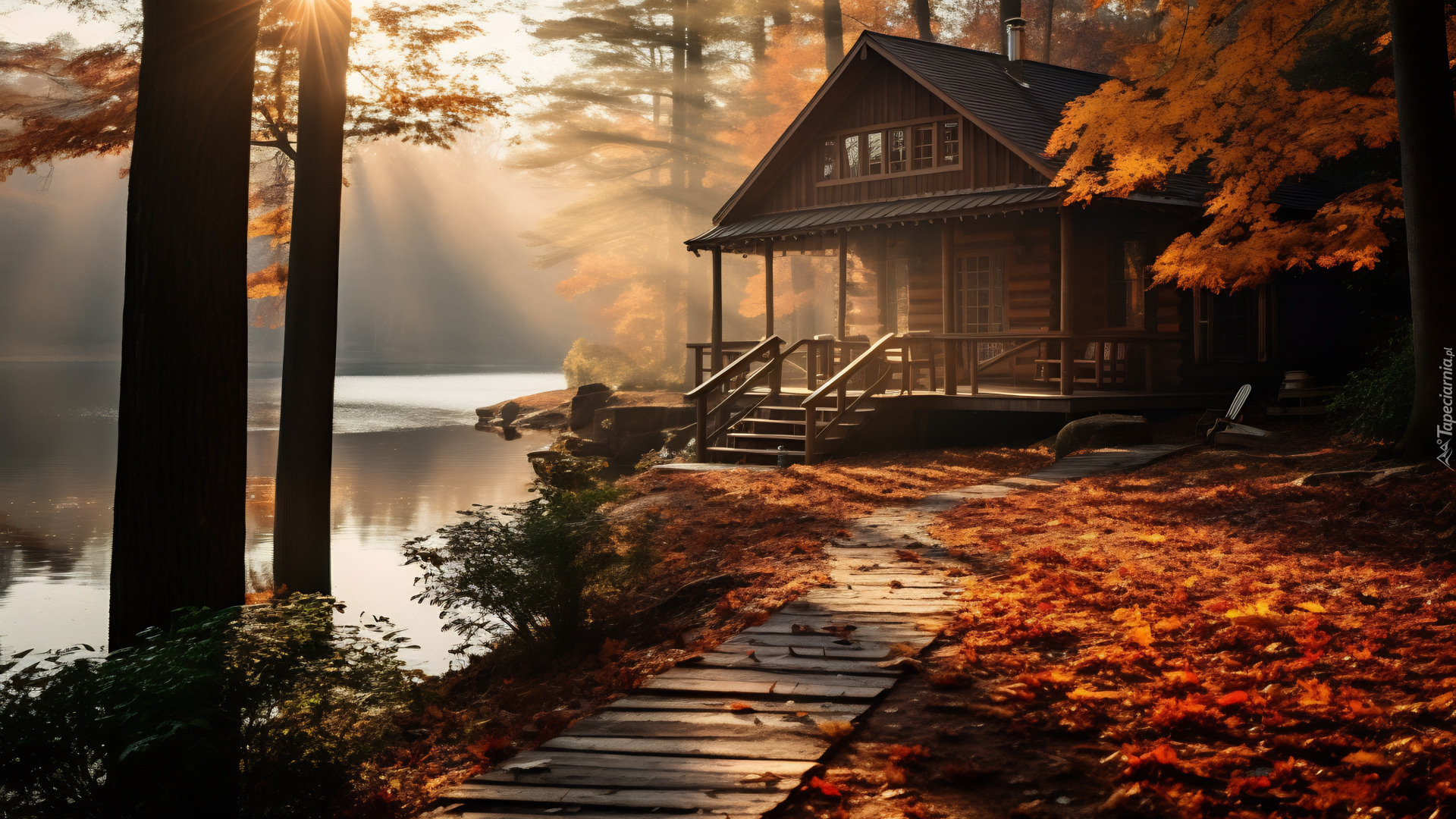 Edytor tapety: Drewniany dom na brzegu jeziora w jesiennym lesie