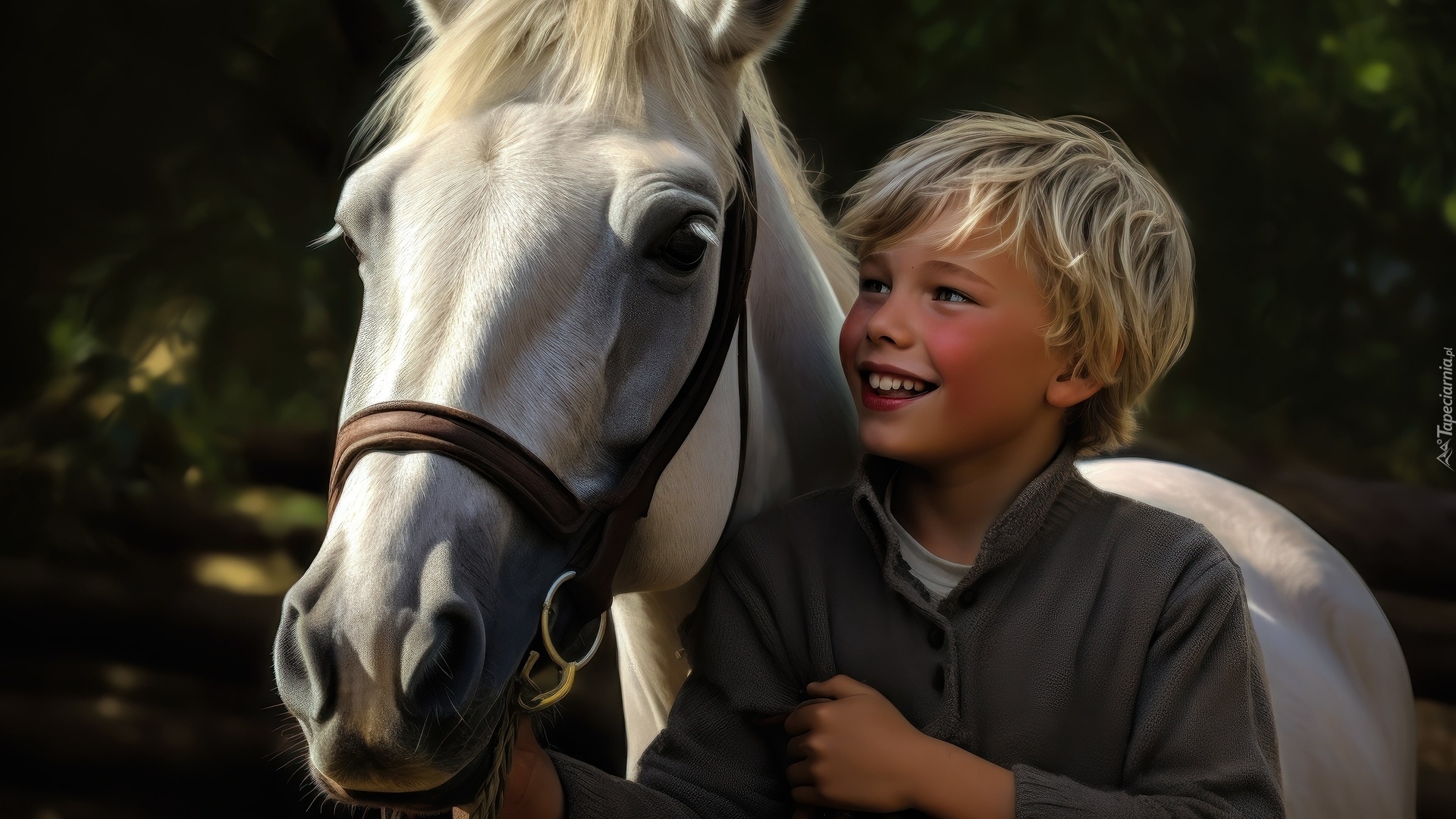Edytor tapety: Uśmiechnięty chłopiec i biały koń