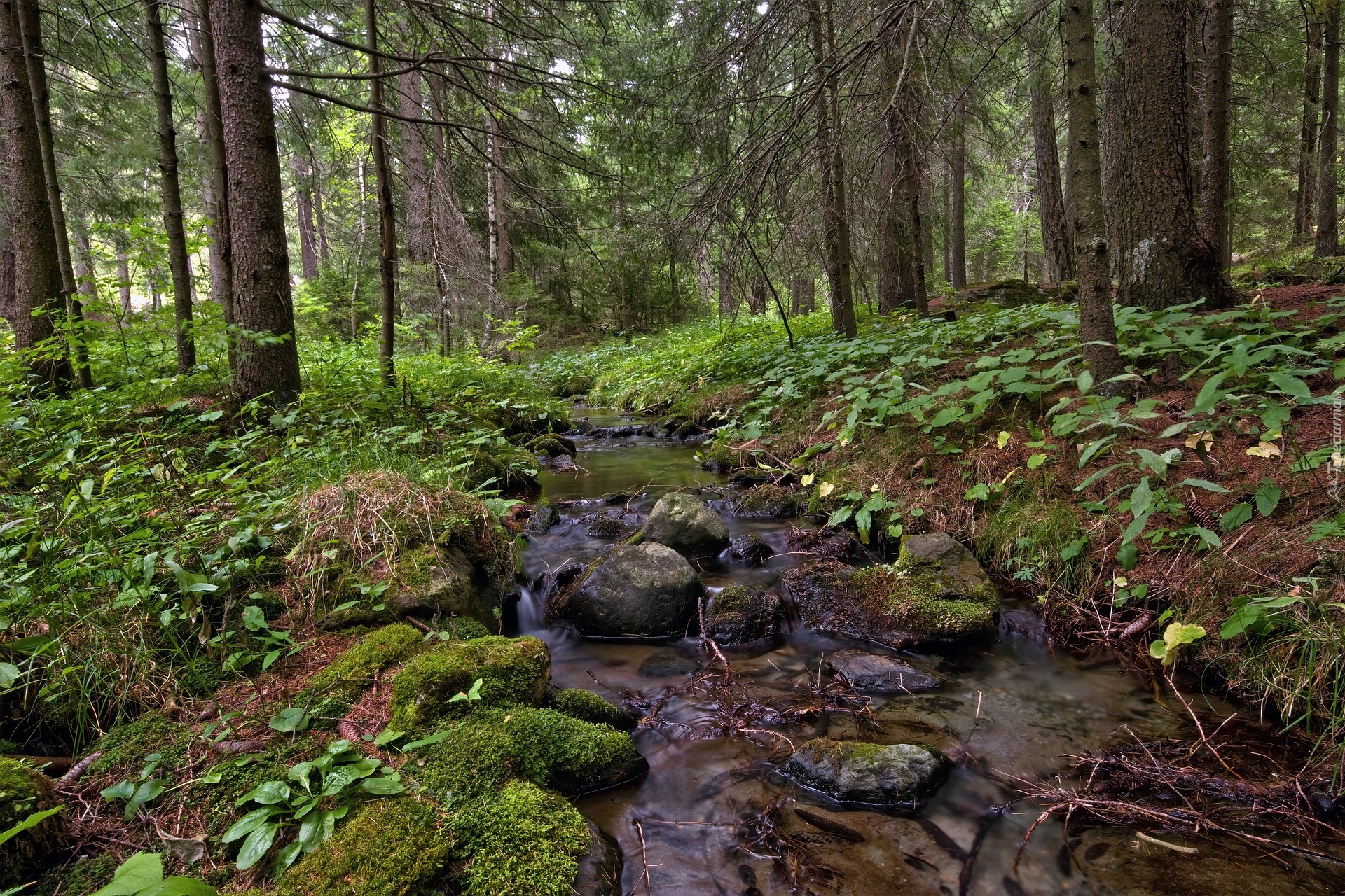 Edytor tapety: Omszałe kamienie w potoku w lesie iglastym