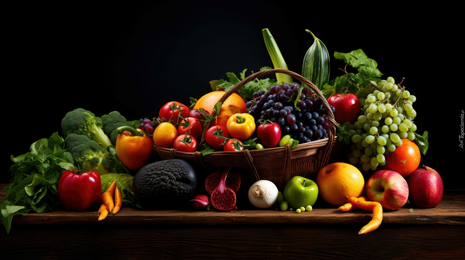 Edytor tapety: Owoce i warzywa w koszu i obok
