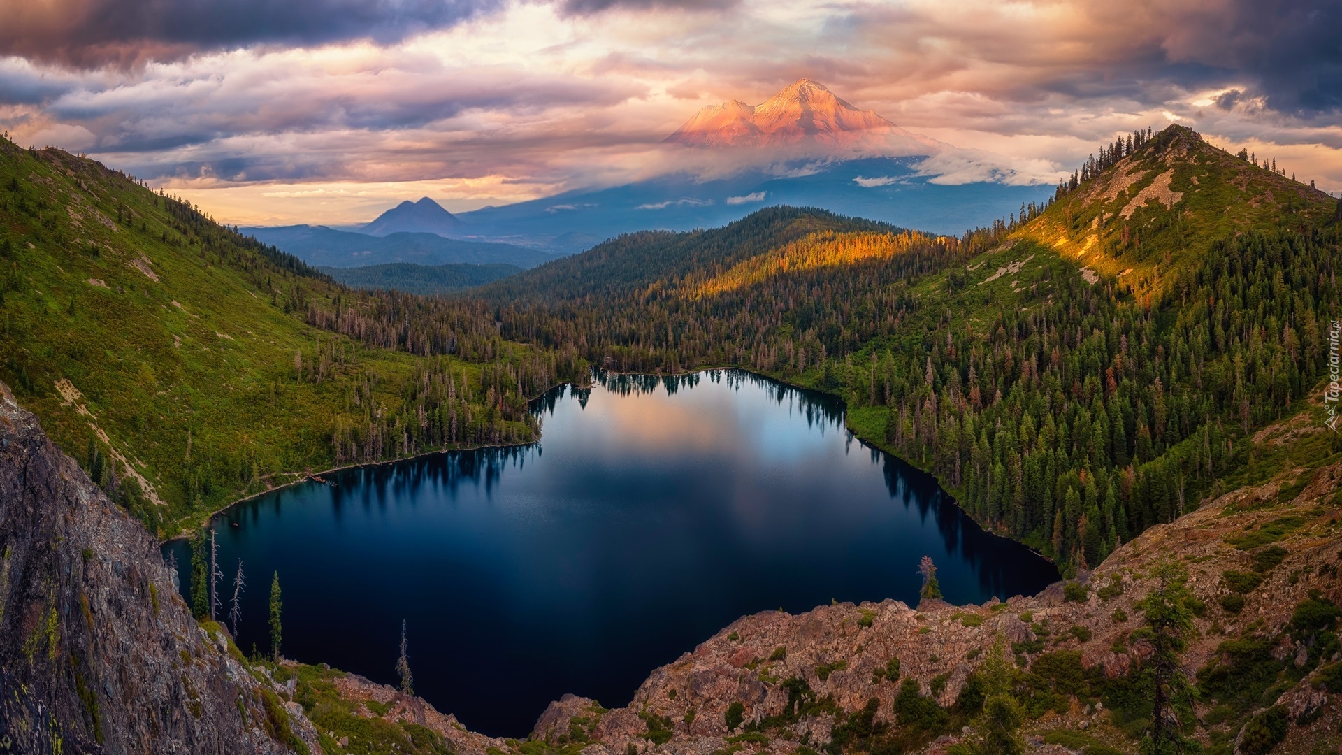 Edytor tapety: Jezioro Castle Lake i zalesione góry pod chmurami