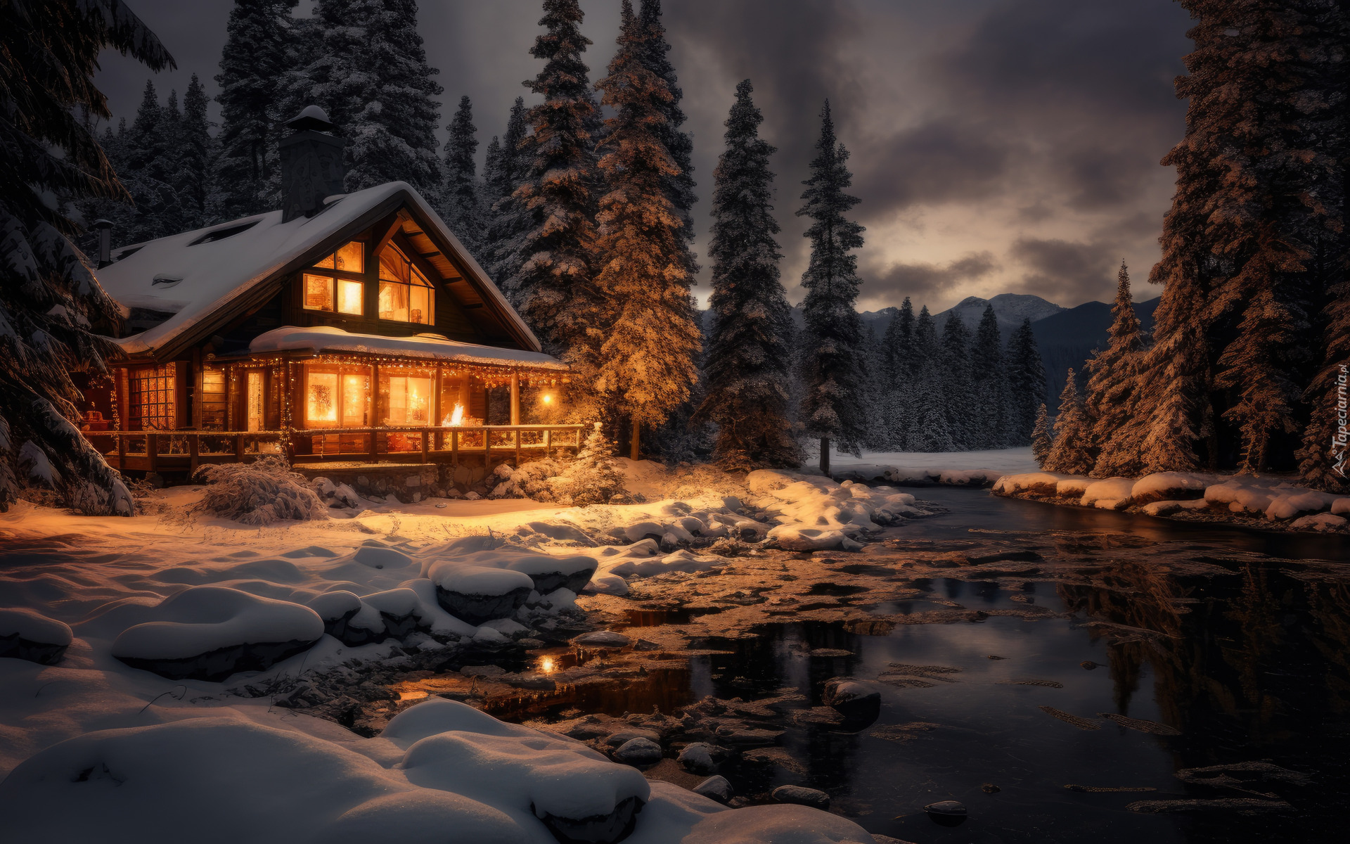 Edytor tapety: Oświetlony dom nad rzeką wśród ośnieżonych drzew