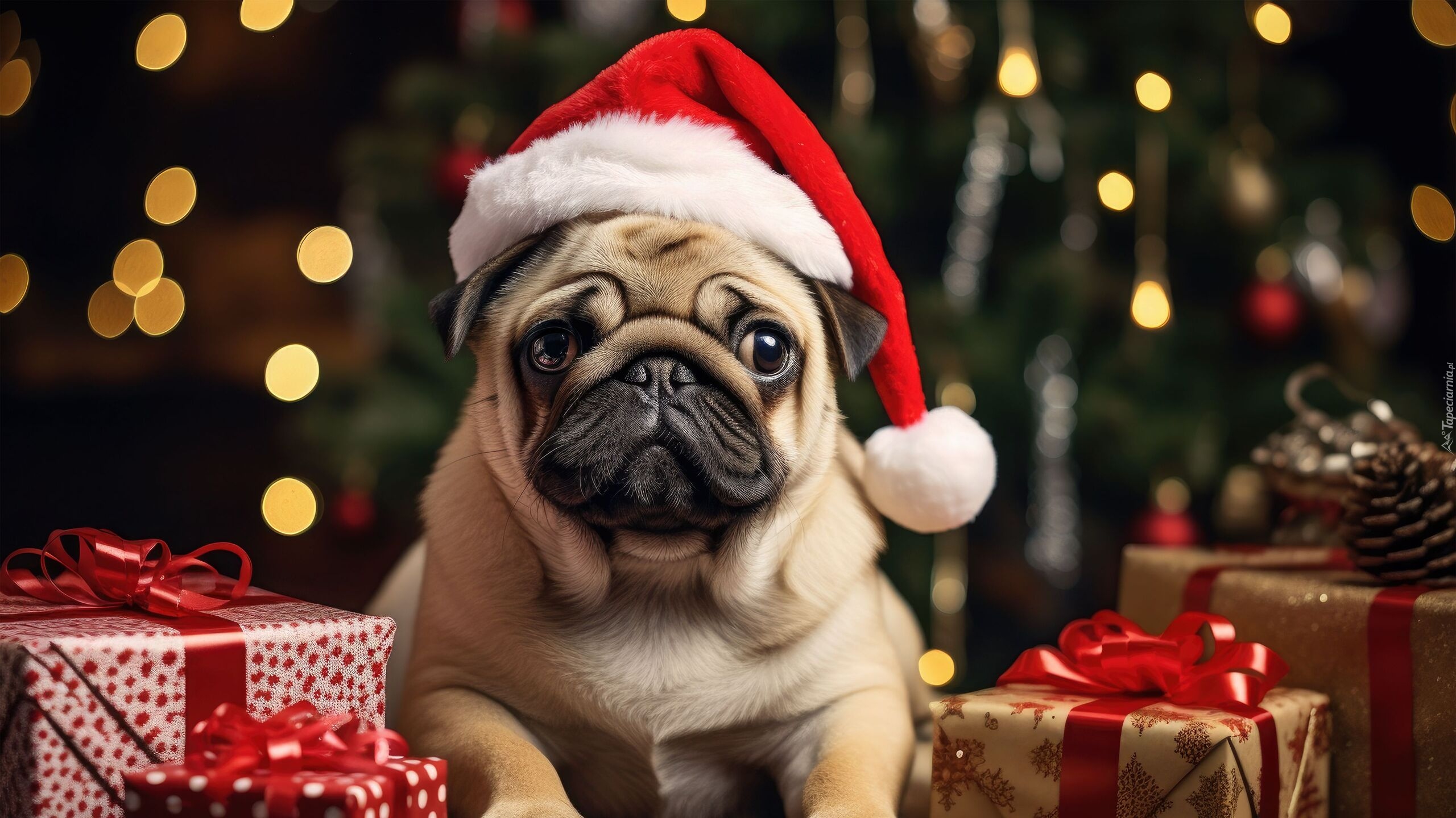 Edytor tapety: Mops w czapce Mikołaja leżący obok prezentów