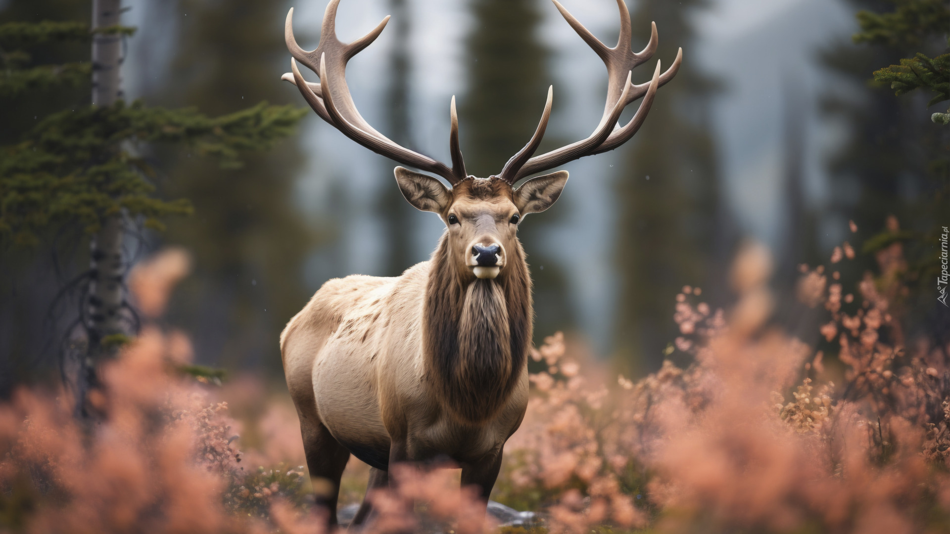 Edytor tapety: Jeleń z okazałym porożem wśród roślinności
