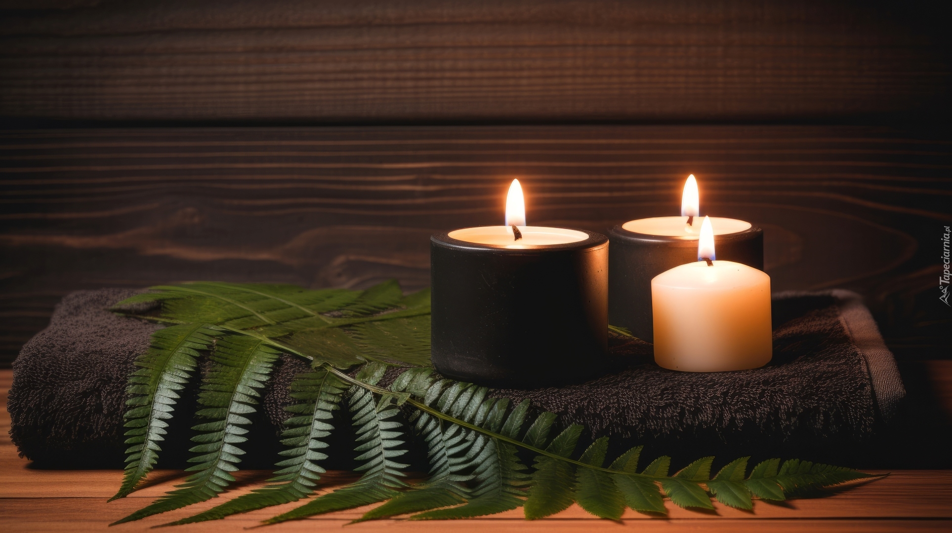 Edytor tapety: Trzy płonące świece obok gałązki paproci