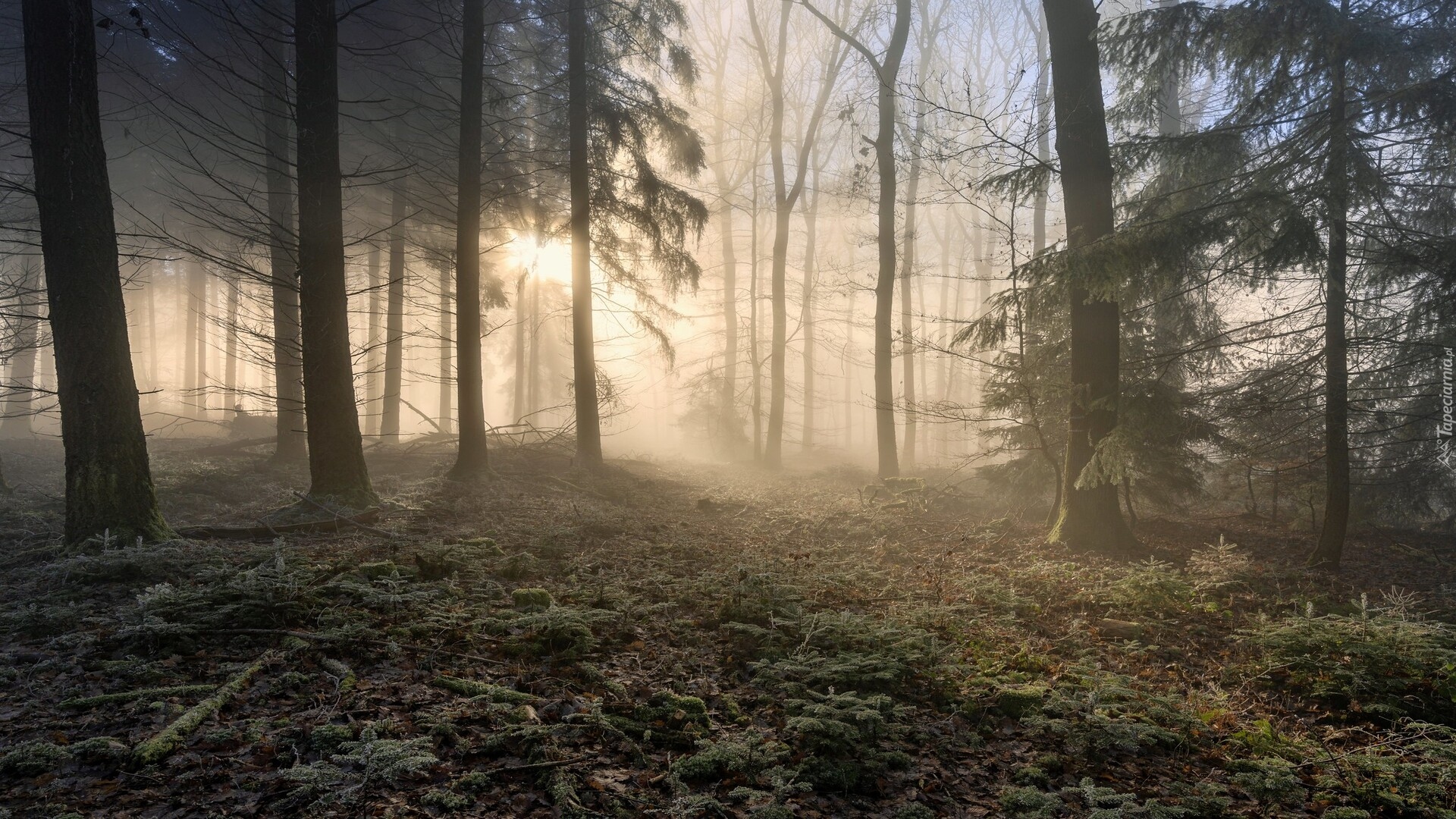 Edytor tapety: Rozproszone promienie słoneczne między drzewami w lesie