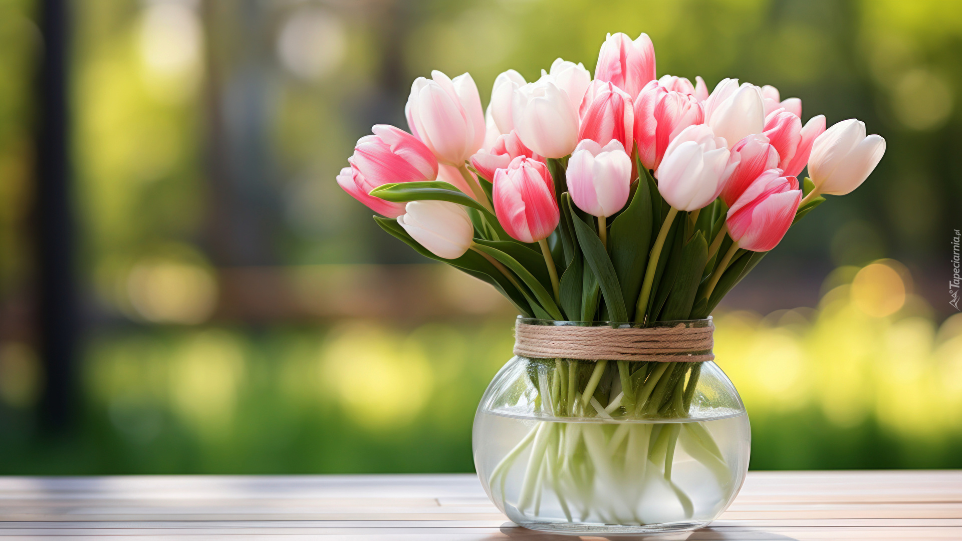 Edytor tapety: Różowe tulipany w szklanym wazonie