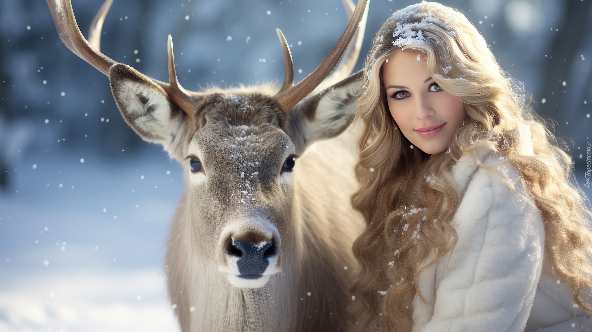 Edytor tapety: Długowłosa blondynka obok jelenia