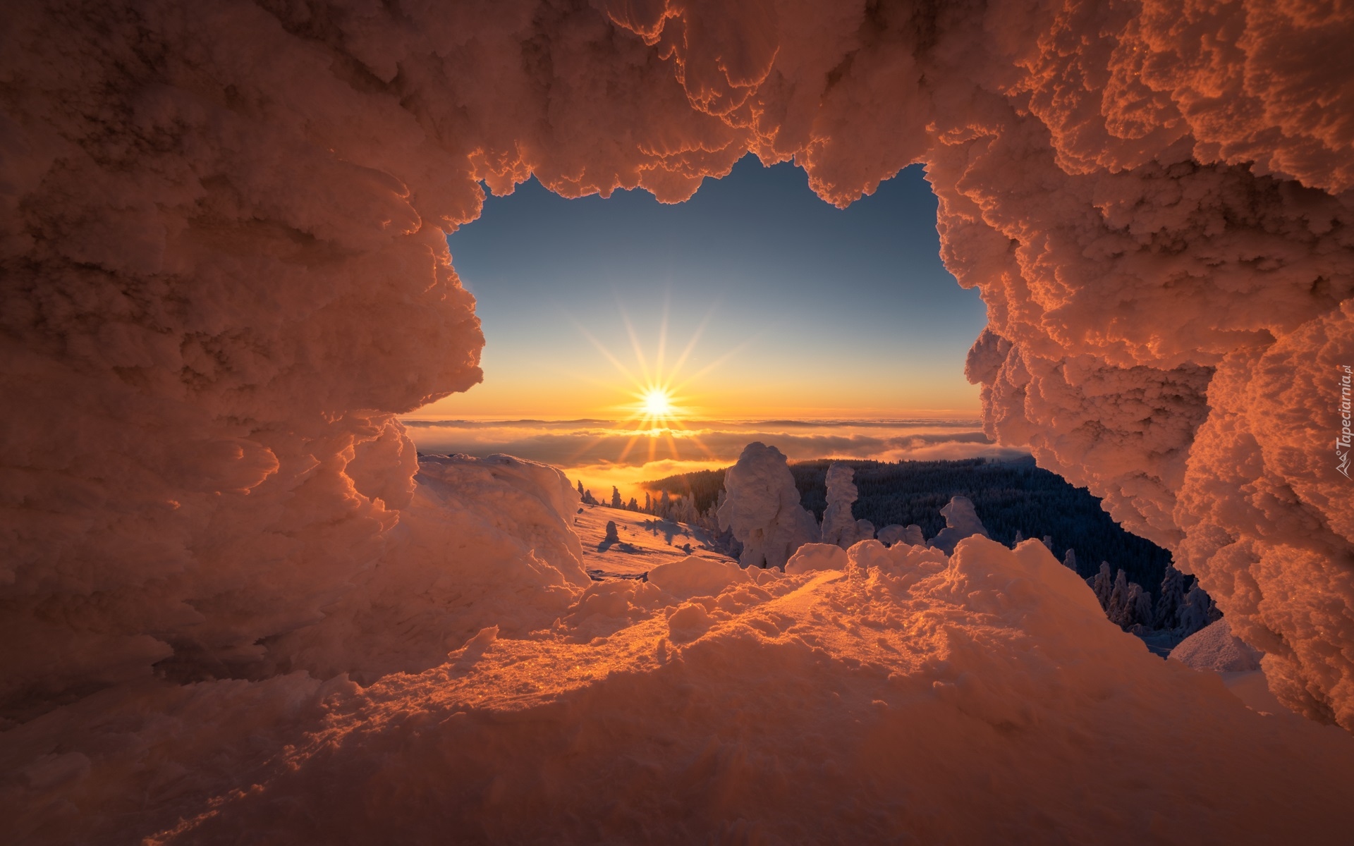 Edytor tapety: Widok z zaśnieżonej jaskini na wschód słońca