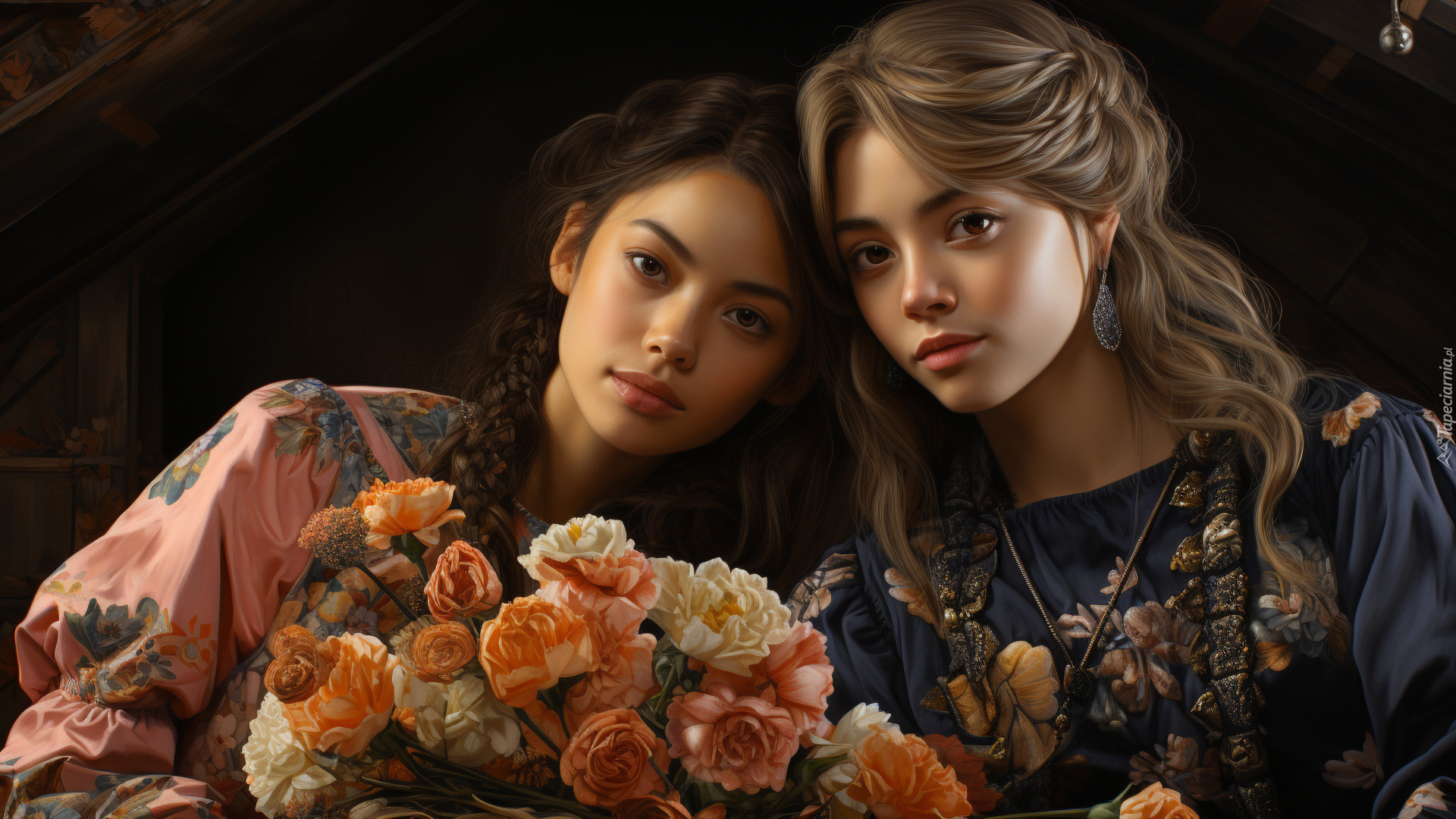Edytor tapety: Dwie kobiety z bukietem kwiatów