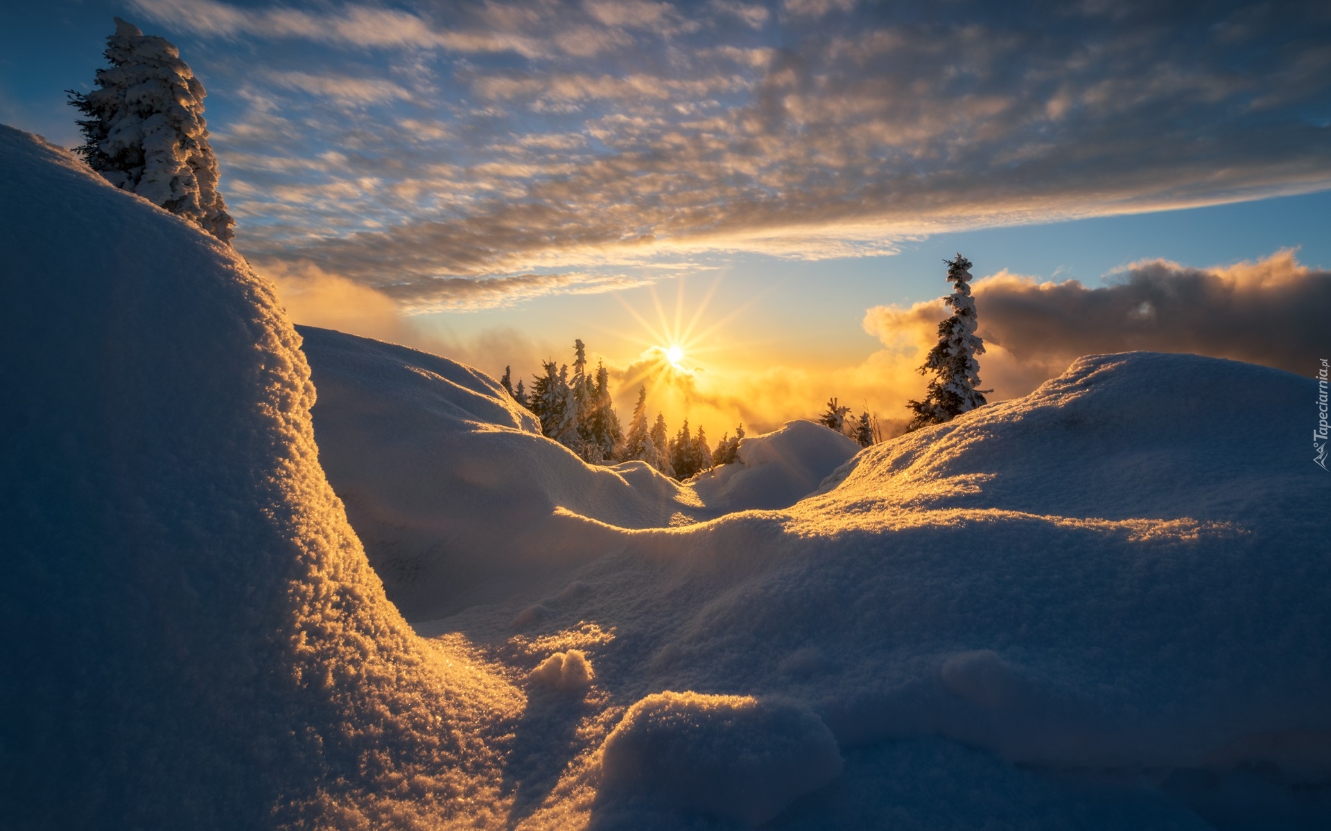 Edytor tapety: Zaspy i ośnieżone drzewa w blasku wschodzącego słońca