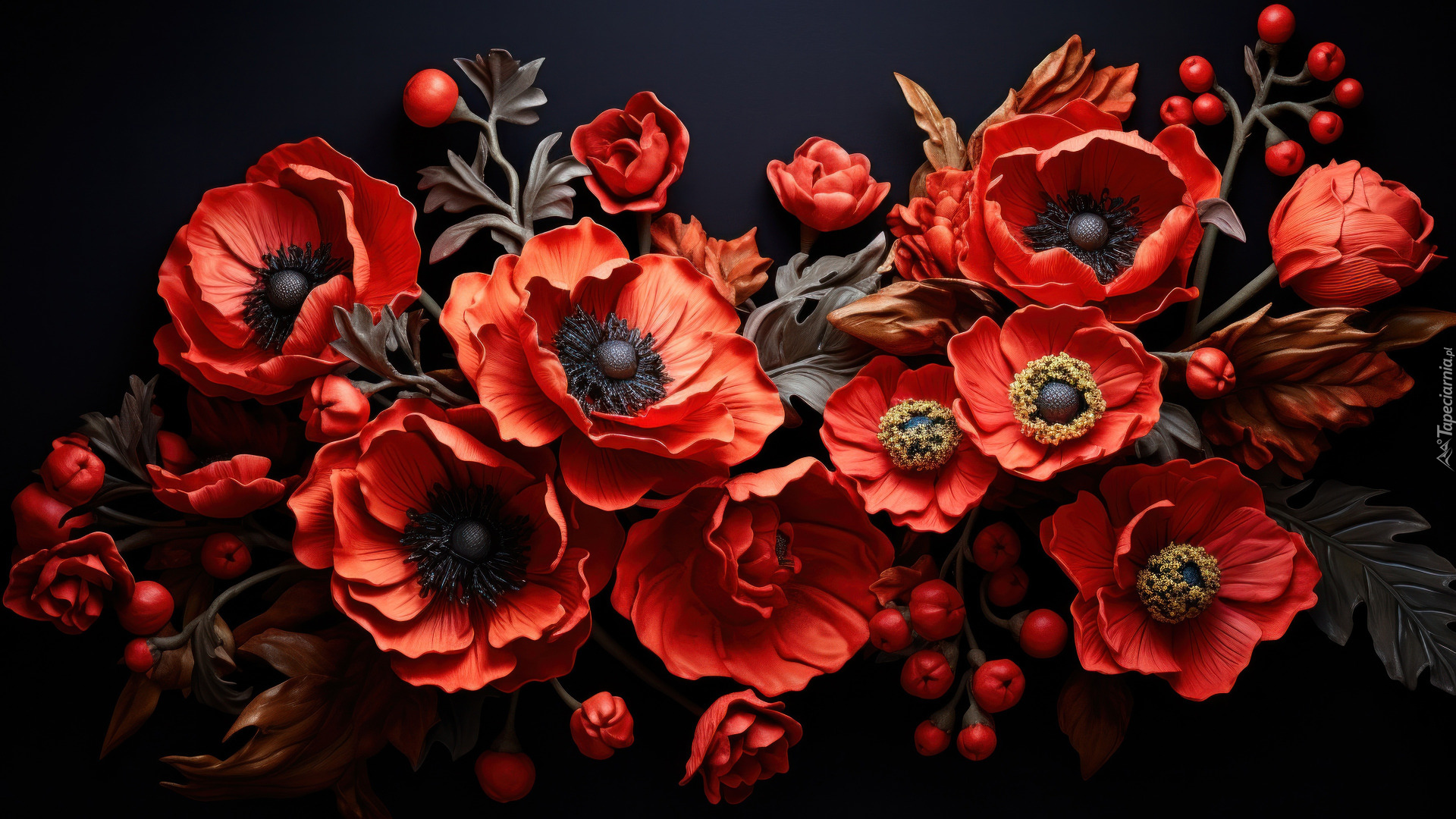Edytor tapety: Rozkwitnięte czerwone maki na czarnym tle