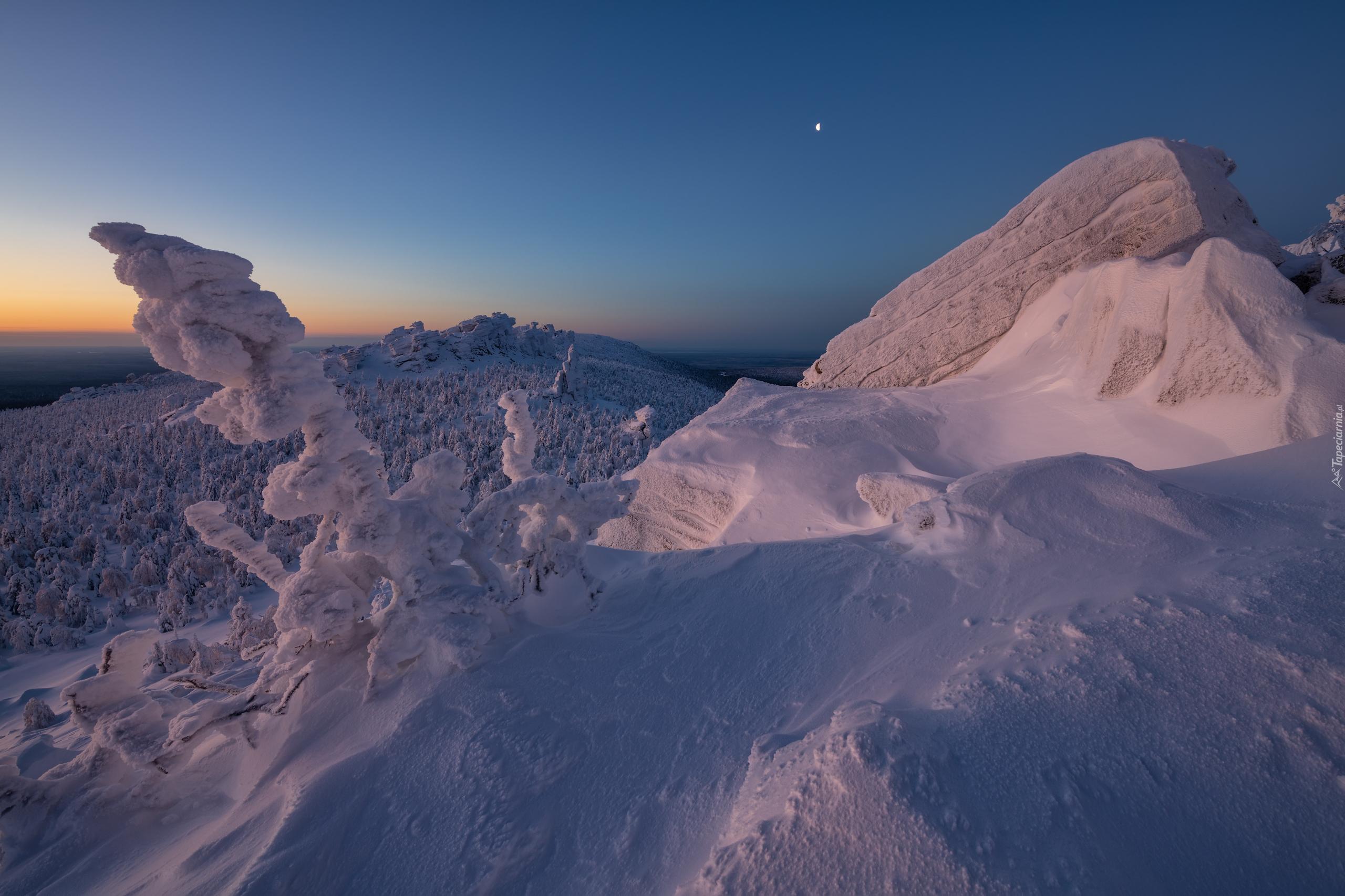 Edytor tapety: Ośnieżone drzewa i góry o poranku