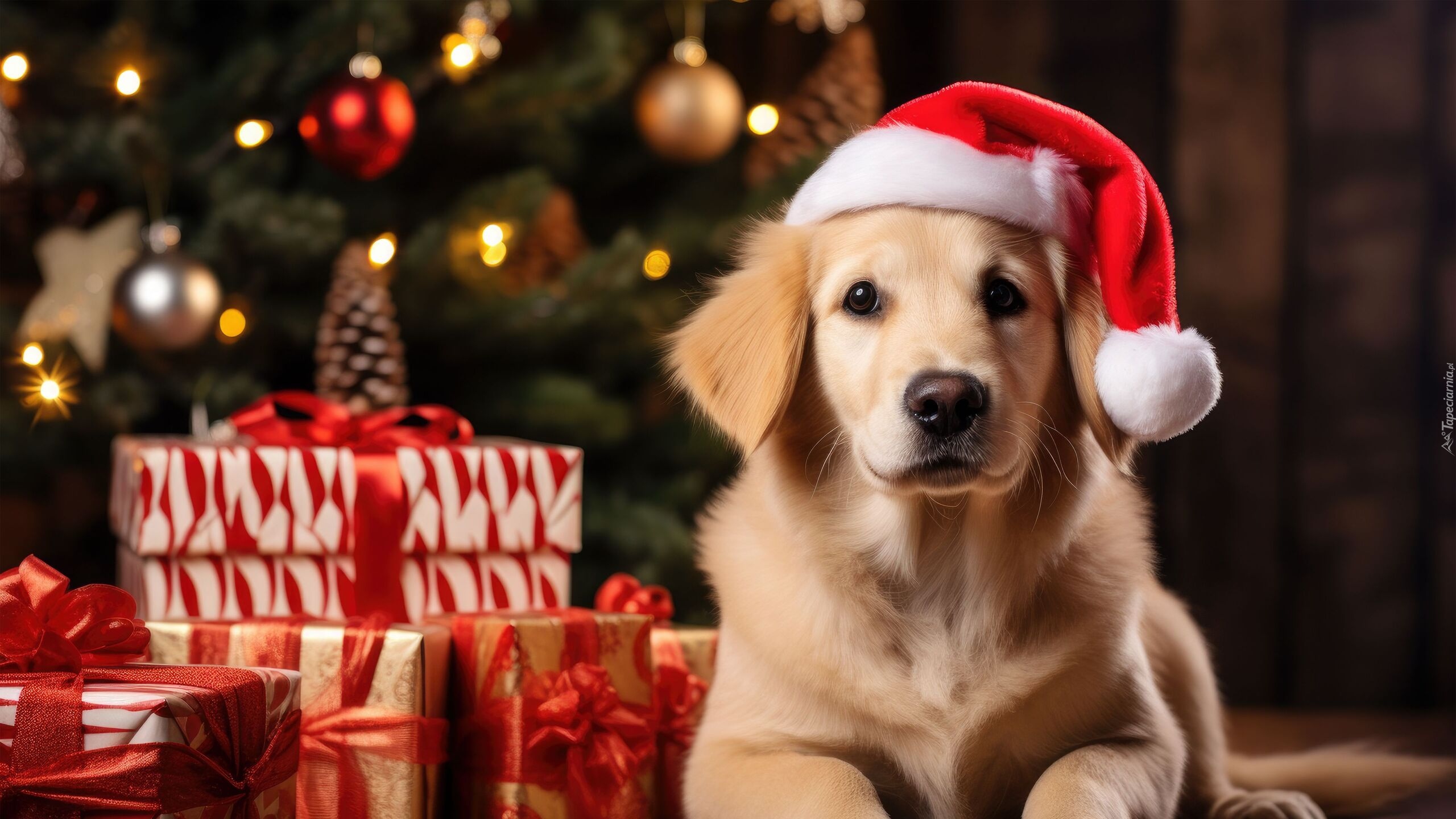 Edytor tapety: Golden retriever w czapce Mikołaja obok prezentów
