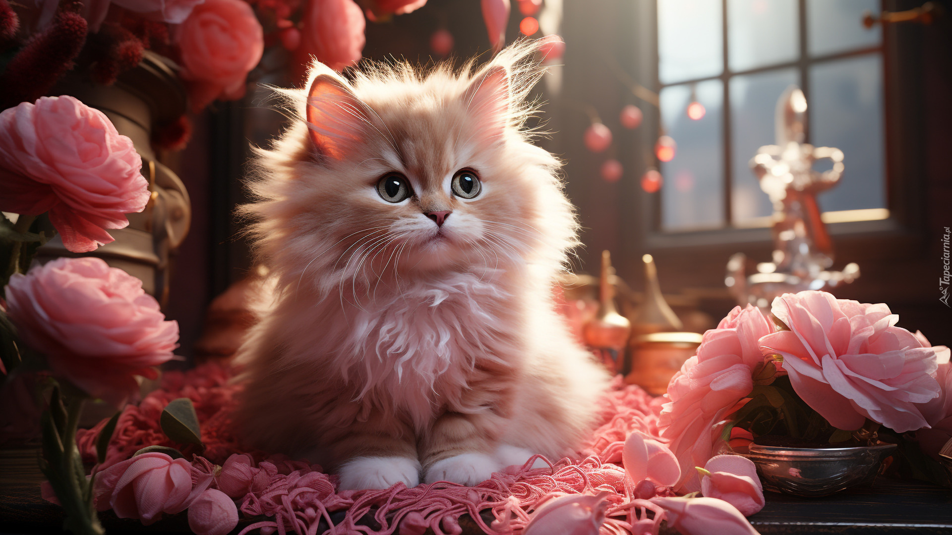 Edytor tapety: Puszysty kotek i różowe kwiaty