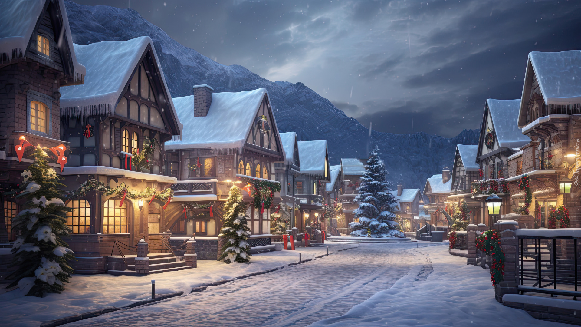Edytor tapety: Oświetlone domy nocą przy zaśnieżonej ulicy
