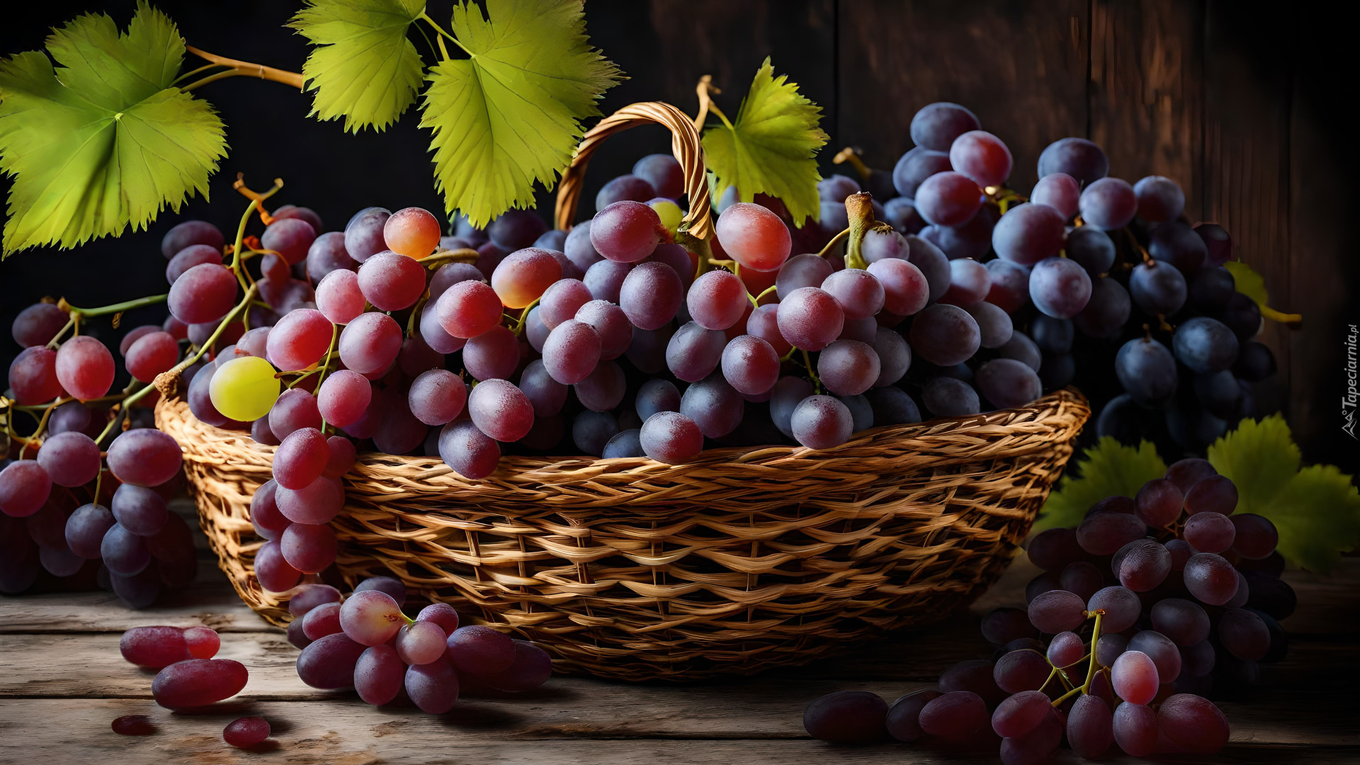 Edytor tapety: Rozświetlone kiście winogron w koszyku